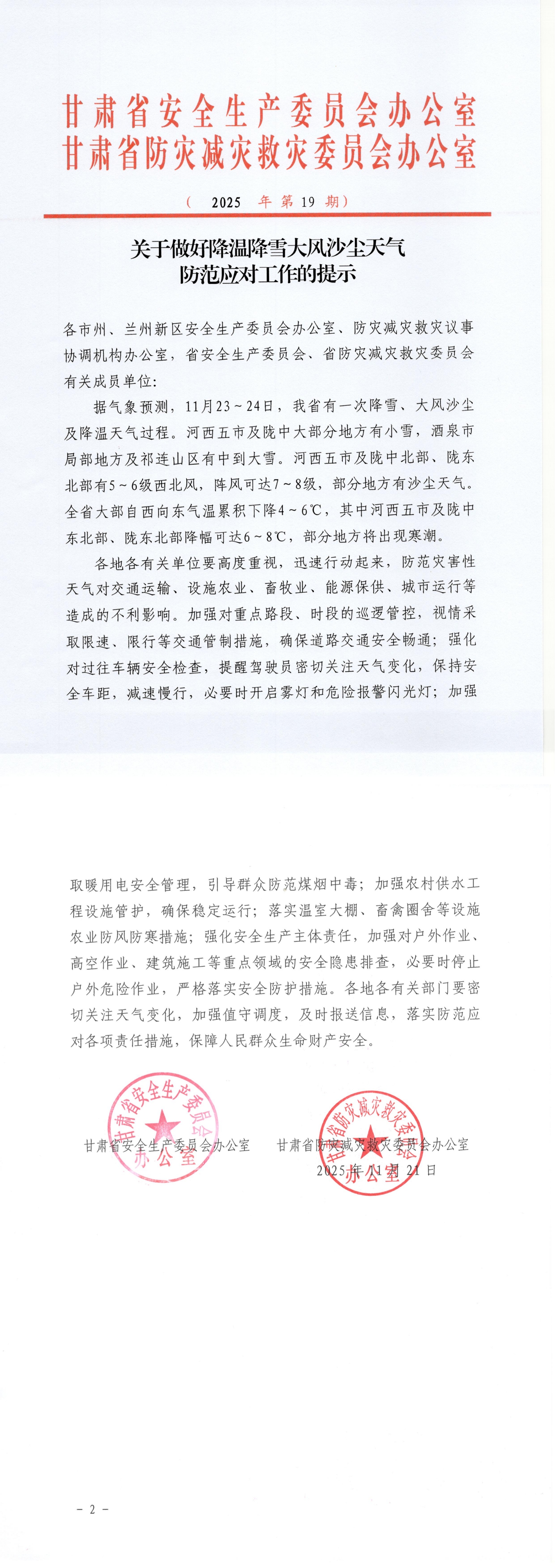 甘肃省安全生产委员会办公室甘肃省防灾减灾救灾委员会办公室关于做好降温降雪大风沙尘天气防范应对工作的提示