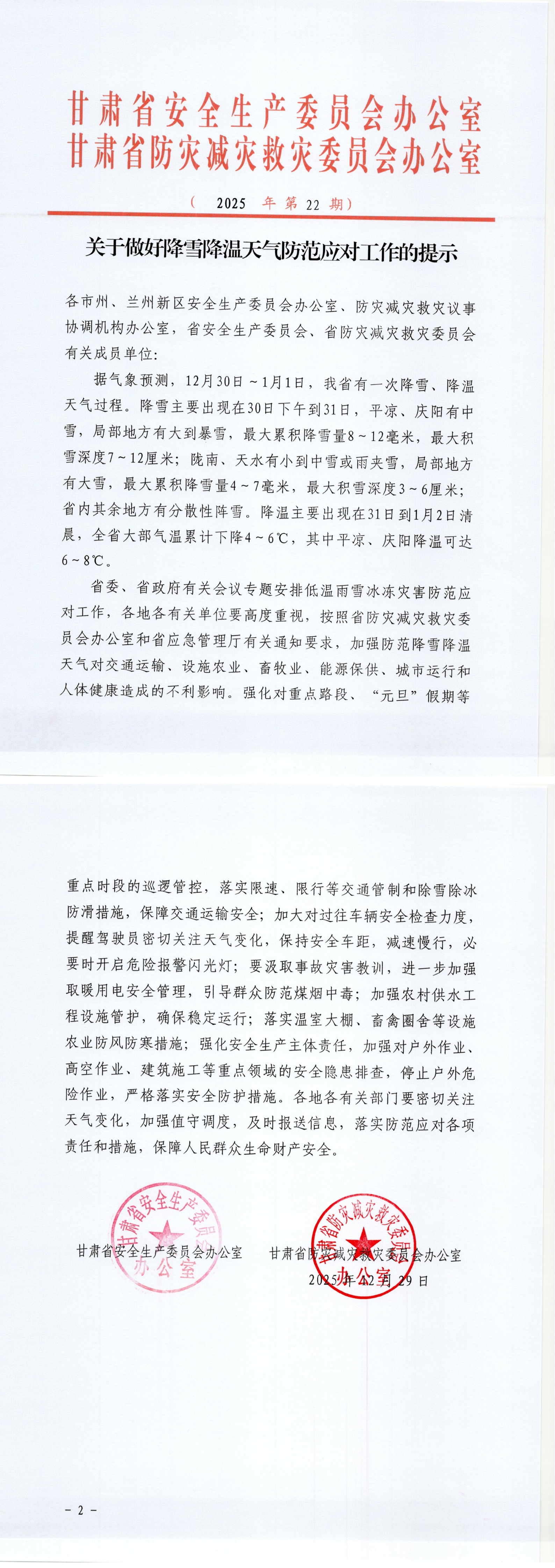 甘肃省安全生产委员会办公室甘肃省防灾减灾救灾委员会办公室关于做好降雪降温天气防范应对工作的提示