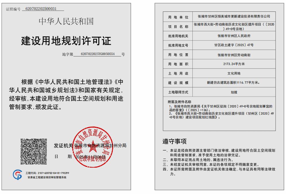 张掖市西大街-劳动南街历史文化街区提升项目(〔2020〕49-D号宗地)建设用地规划许可证批后公示