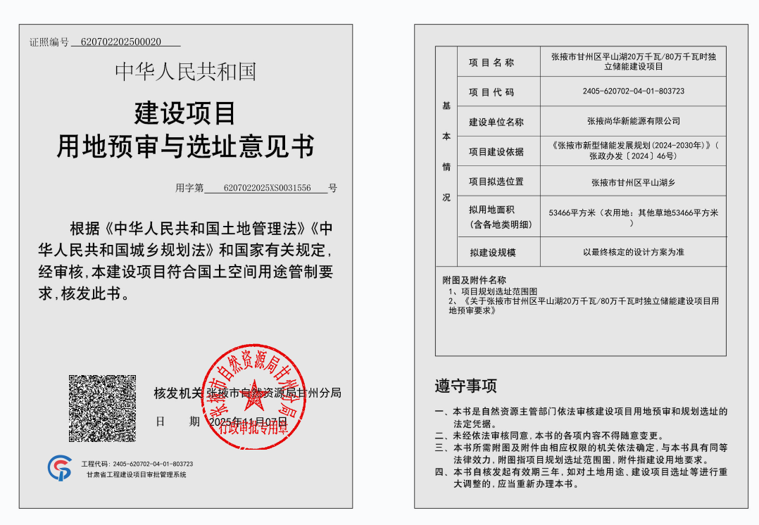 张掖市甘州区平山湖20万千瓦/80万千瓦时独立储能建设项目用地预审与选址意见书批后公示