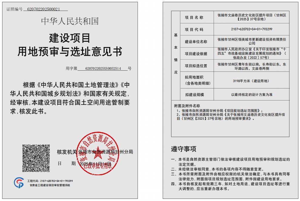 张掖市文庙巷历史文化街区提升项目(甘州区【2025】37号宗地)建设项目用地预审与选址意见书批后公示