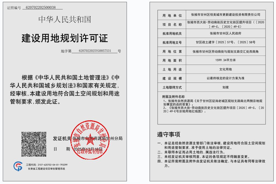 张掖市西大街-劳动南街历史文化街区提升项目(〔2020〕49-C、〔2020〕49-E)建设用地规划许可证批后公示
