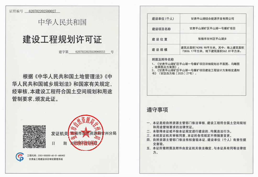 甘肃平山湖矿区平山湖一号煤矿项目工程规划许可证批后公示