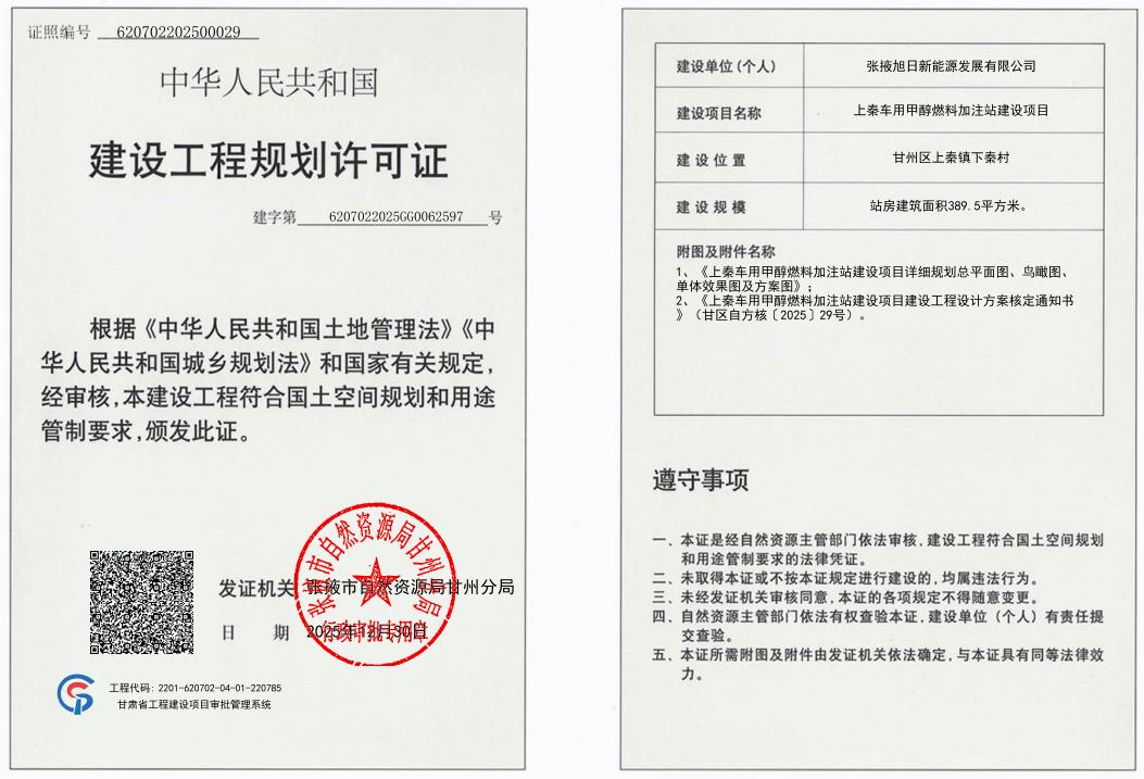 上秦车用甲醇燃料加注站建设项目建设工程规划许可证批后公示