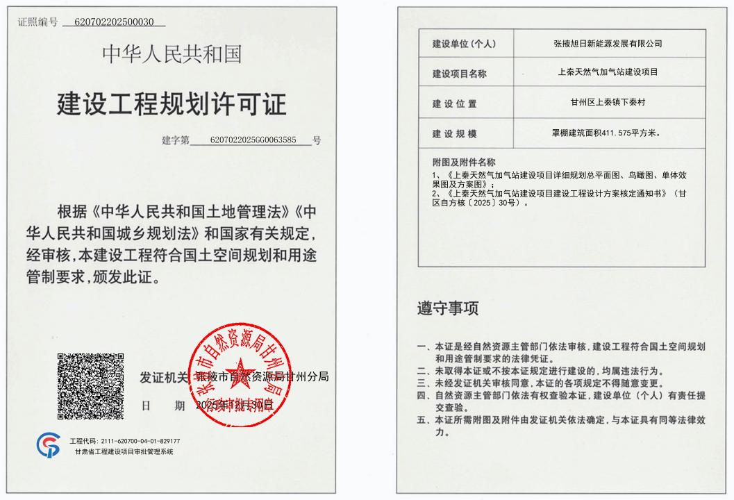 上秦天然气加气站建设项目建设工程规划许可证批后公示