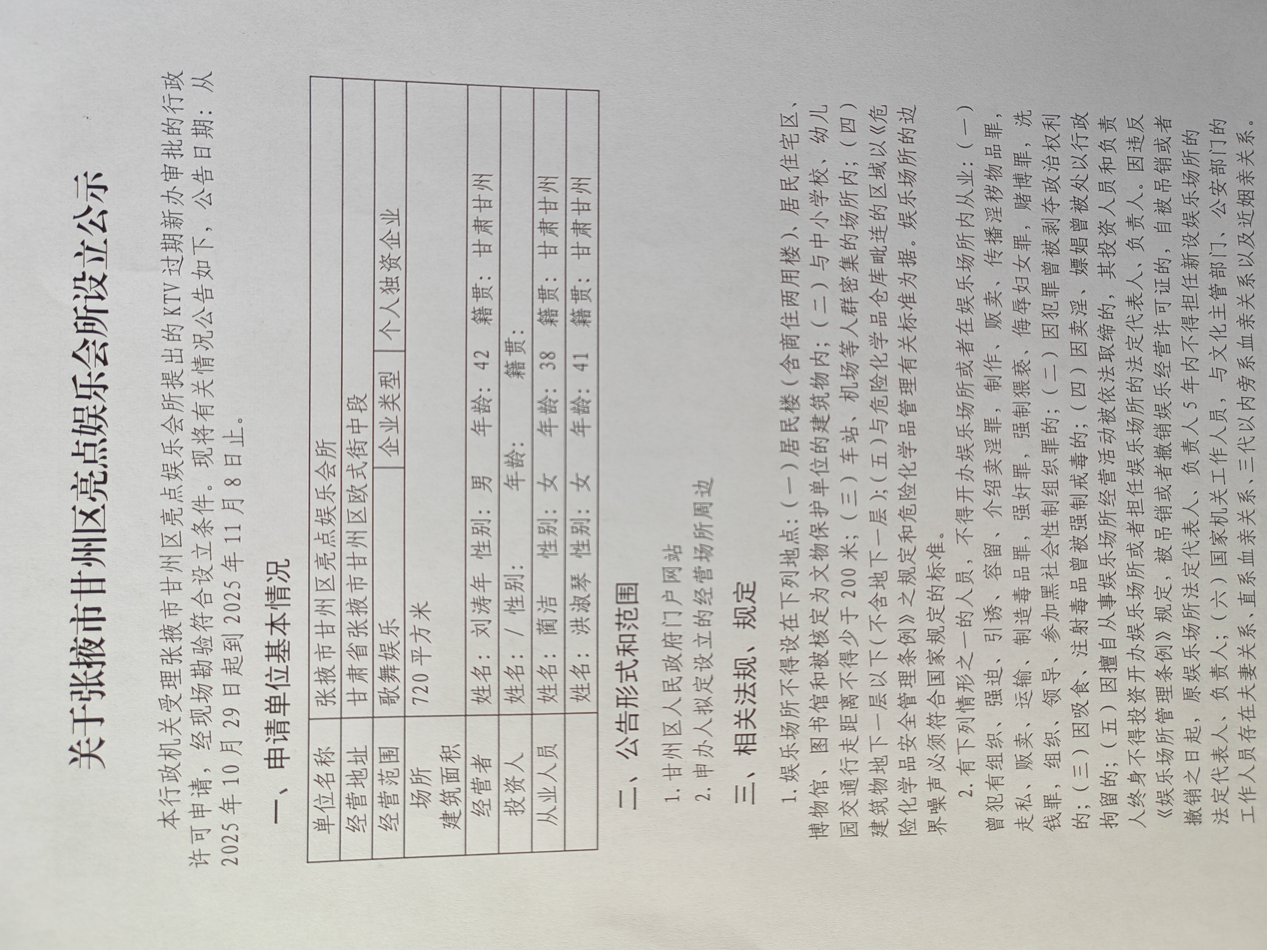 关于张掖市甘州区亮点娱乐会所设立的公示