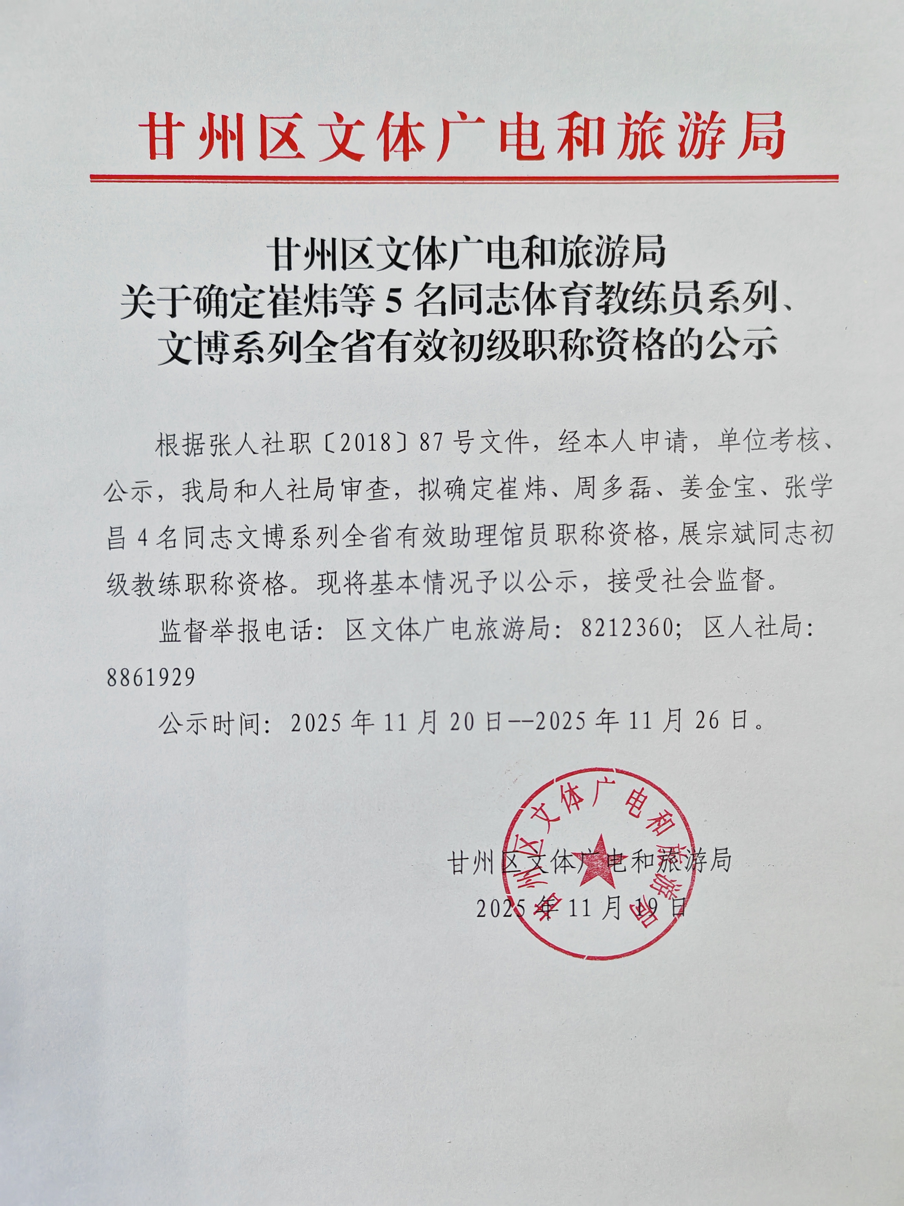 甘州区文体广电和旅游局 关于确定崔炜等5名同志体育教练员系列、 文博系列全省有效初级职称资格的公示