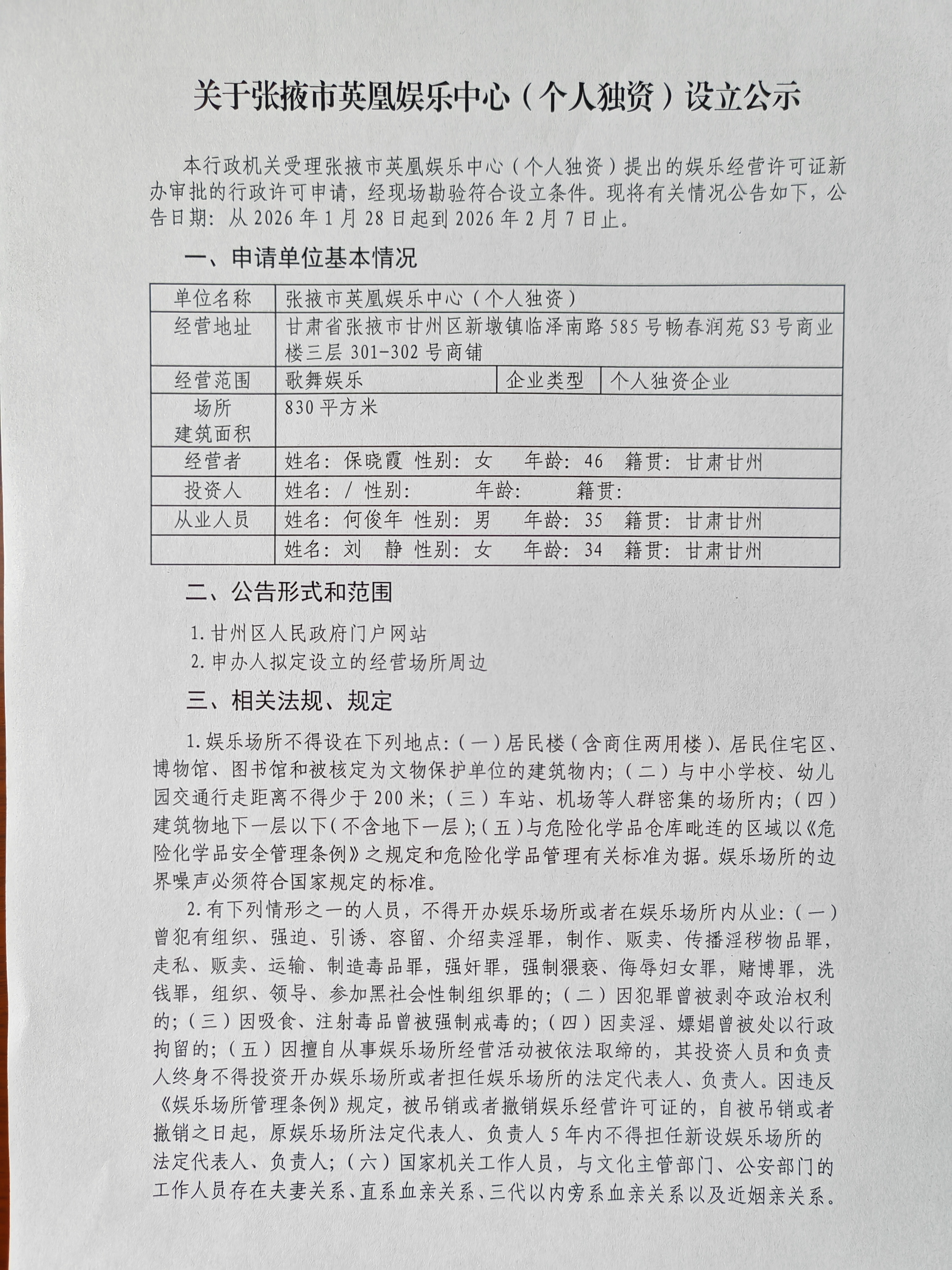 关于张掖市英凰娱乐中心(个人独资)设立公示