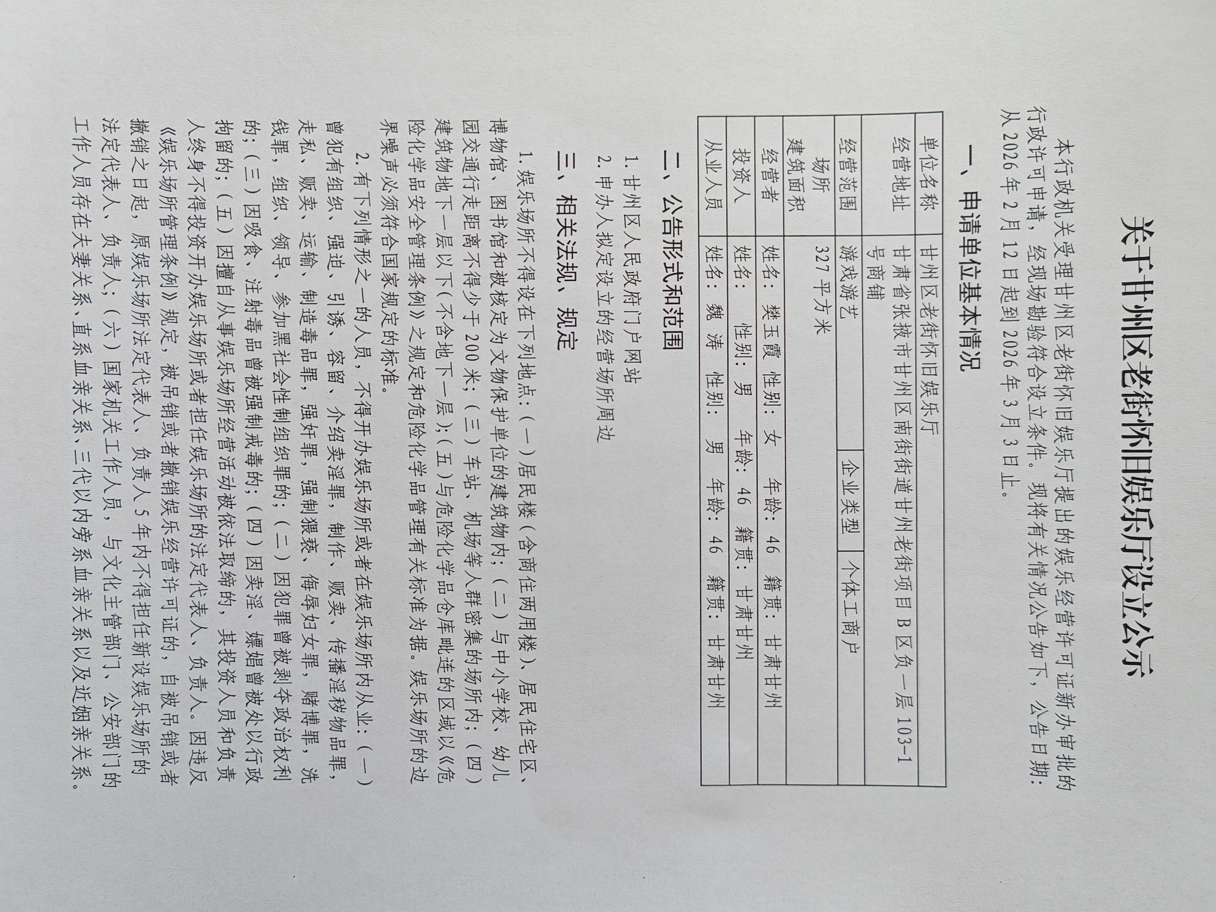关于甘州区老街怀旧娱乐厅设立公示