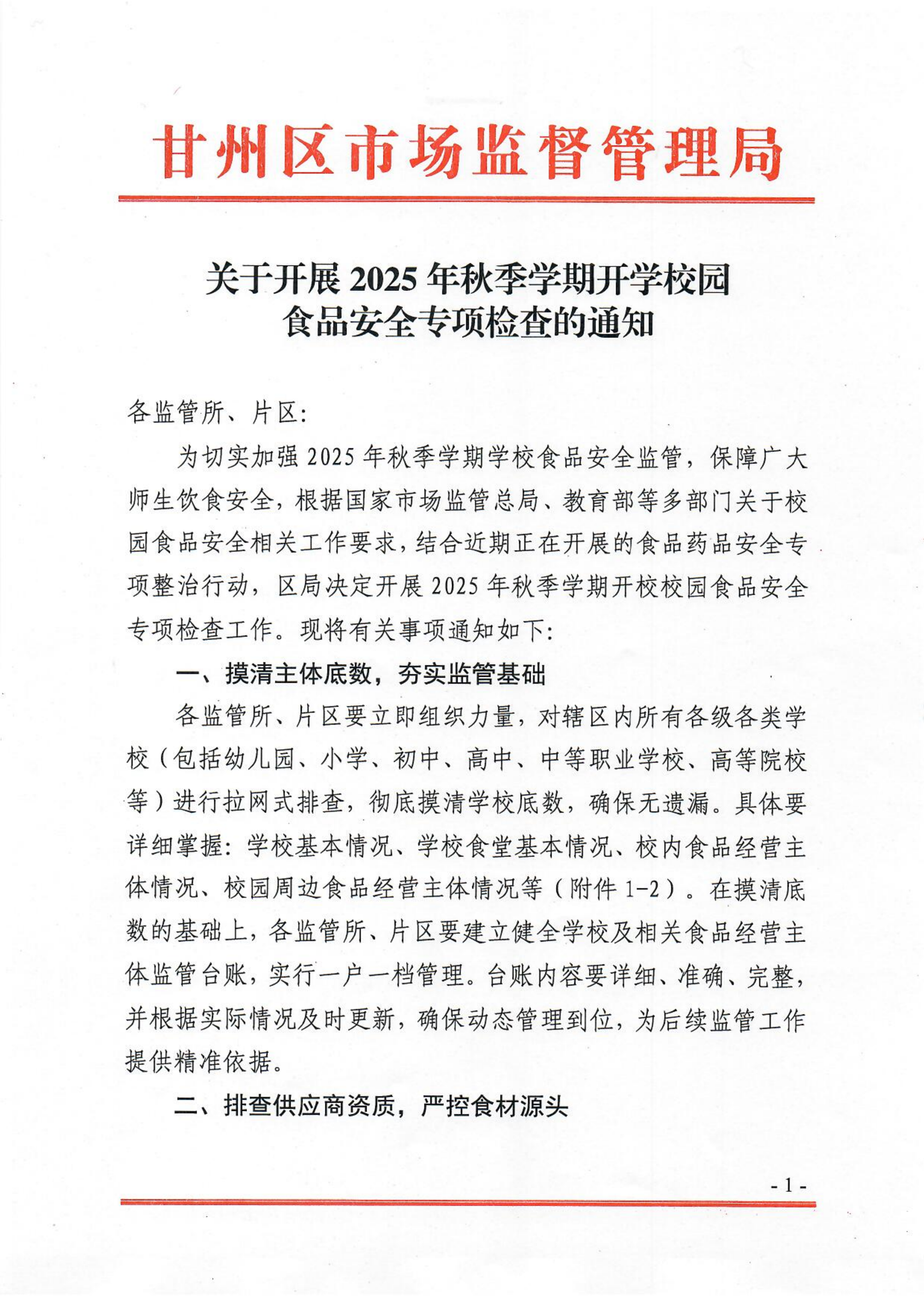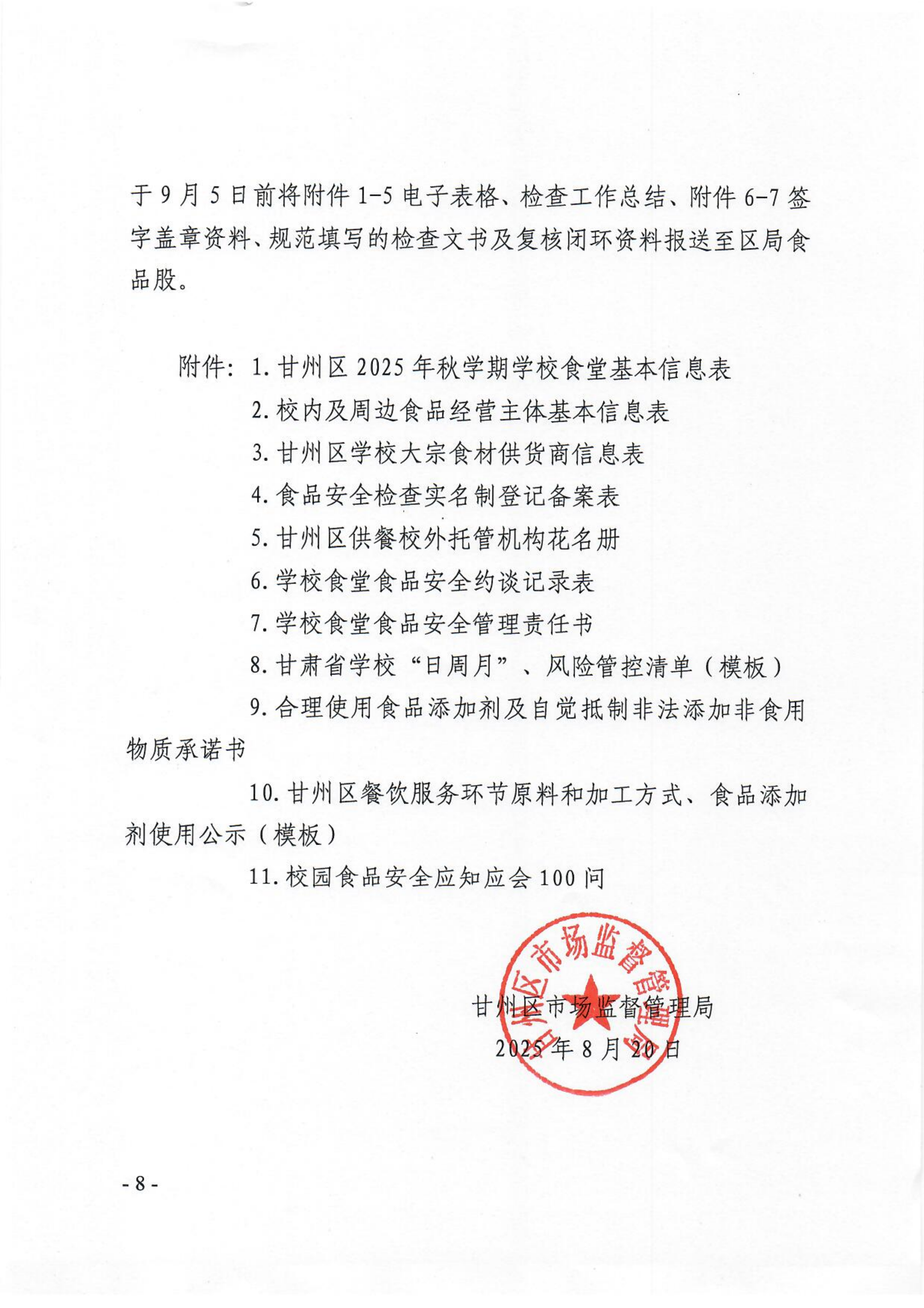 甘州区市场监督管理局关于开展2025年秋季学期开学校园食品安全专项检查的通知