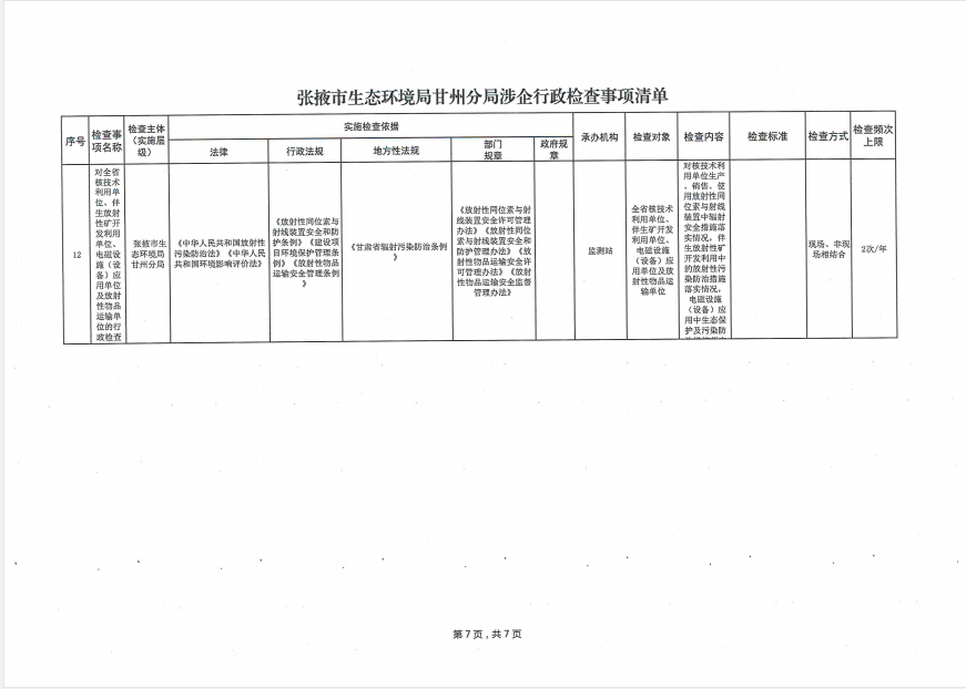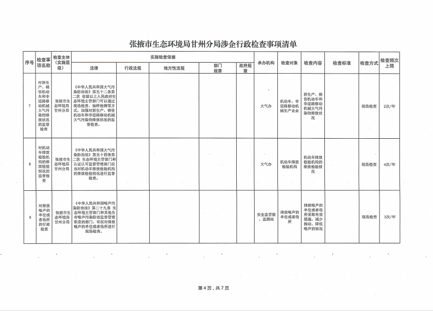 张掖市生态环境局甘州分局涉企行政检查事项清单