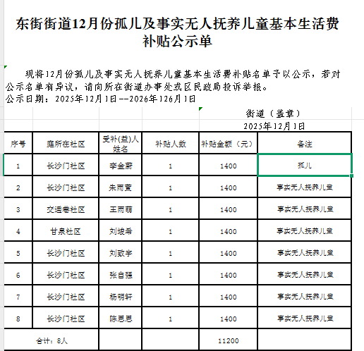 东街街道12月份孤儿及事实无人抚养儿童基本生活费补贴公示