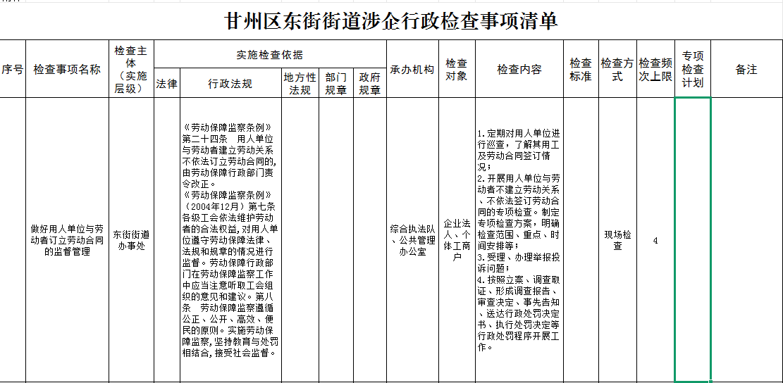 甘州区东街街道涉企行政检查事项清单