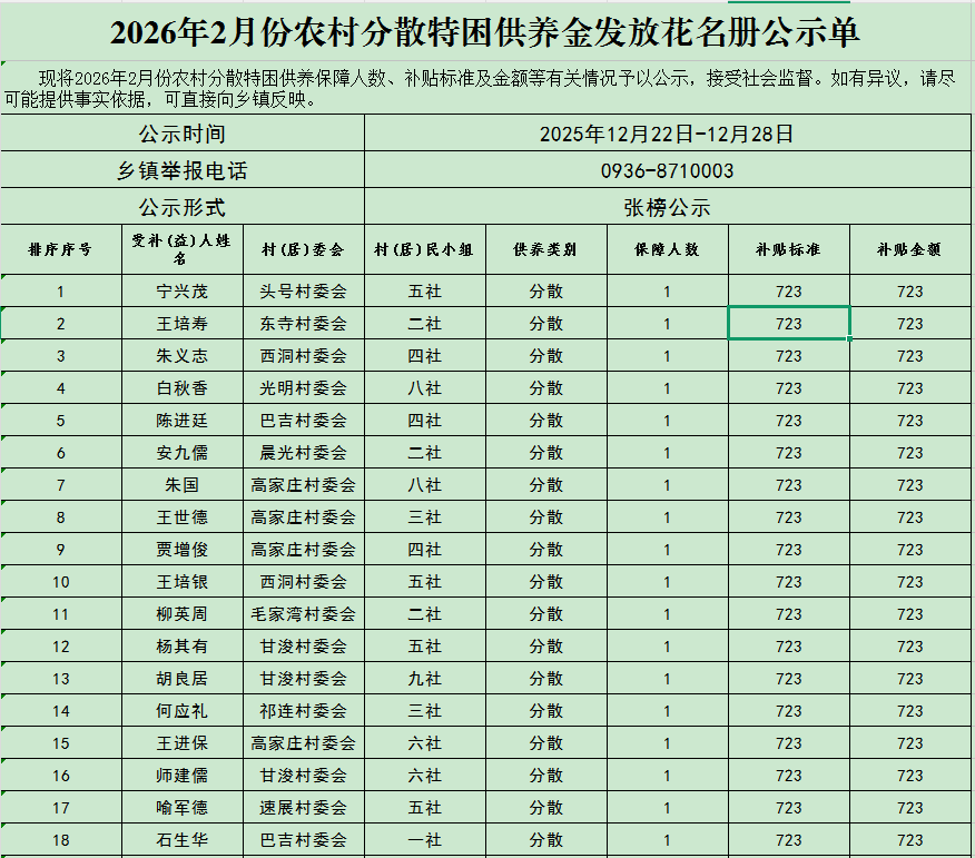 2026年2月份农村分散特困供养金发放花名册公示单
