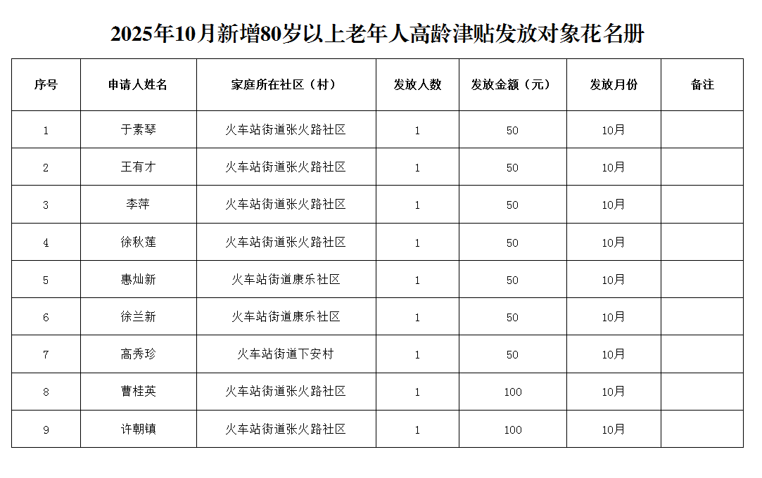 2025年10月新增80岁以上老年人高龄津贴发放对象花名册