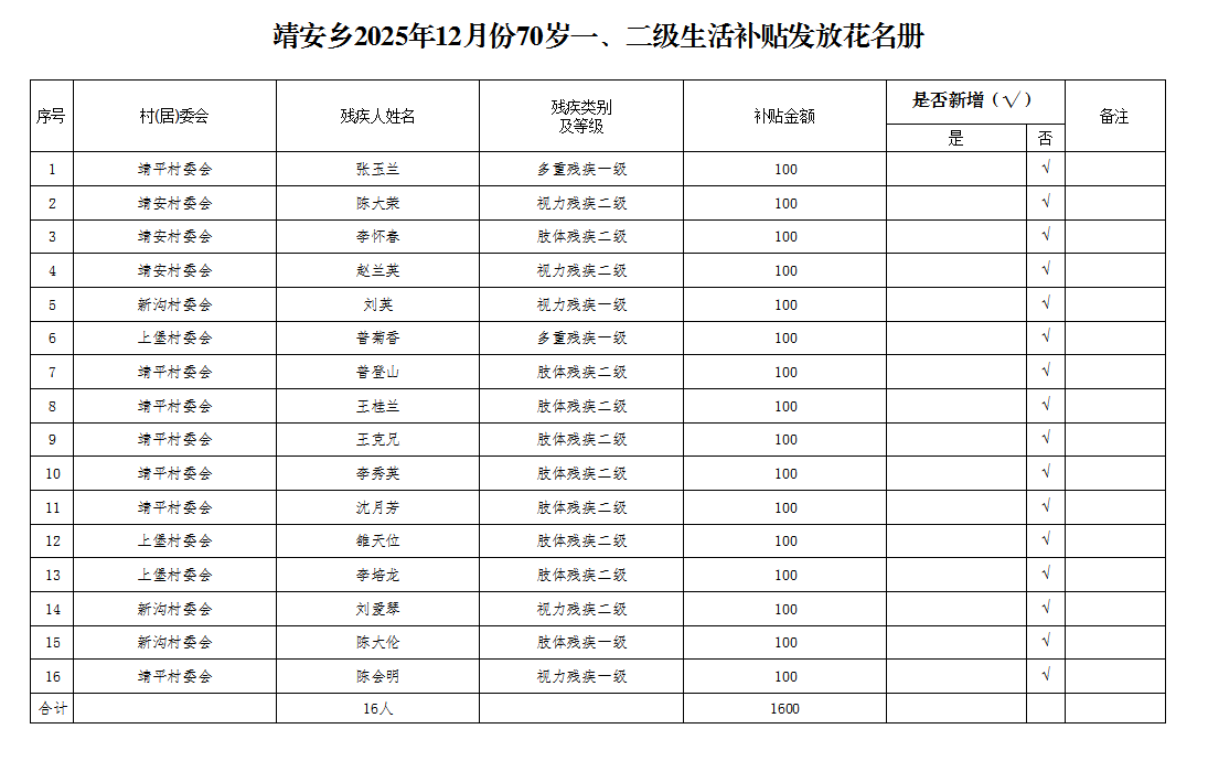 靖安乡2025年12月份70岁一、二级生活补贴发放花名册