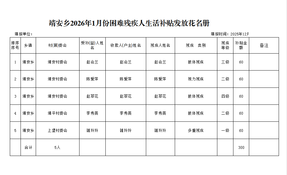 靖安乡2026年1月份困难残疾人生活补贴发放花名册