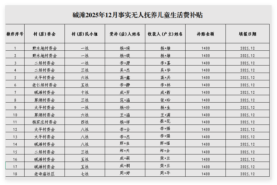 碱滩镇2025年12月事实无人抚养儿童生活费补贴