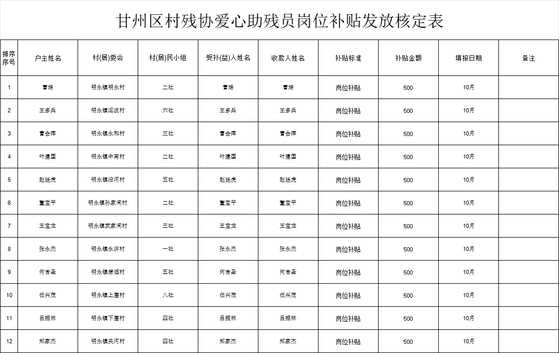甘州区明永镇村残协爱心助残员岗位补贴发放核定表