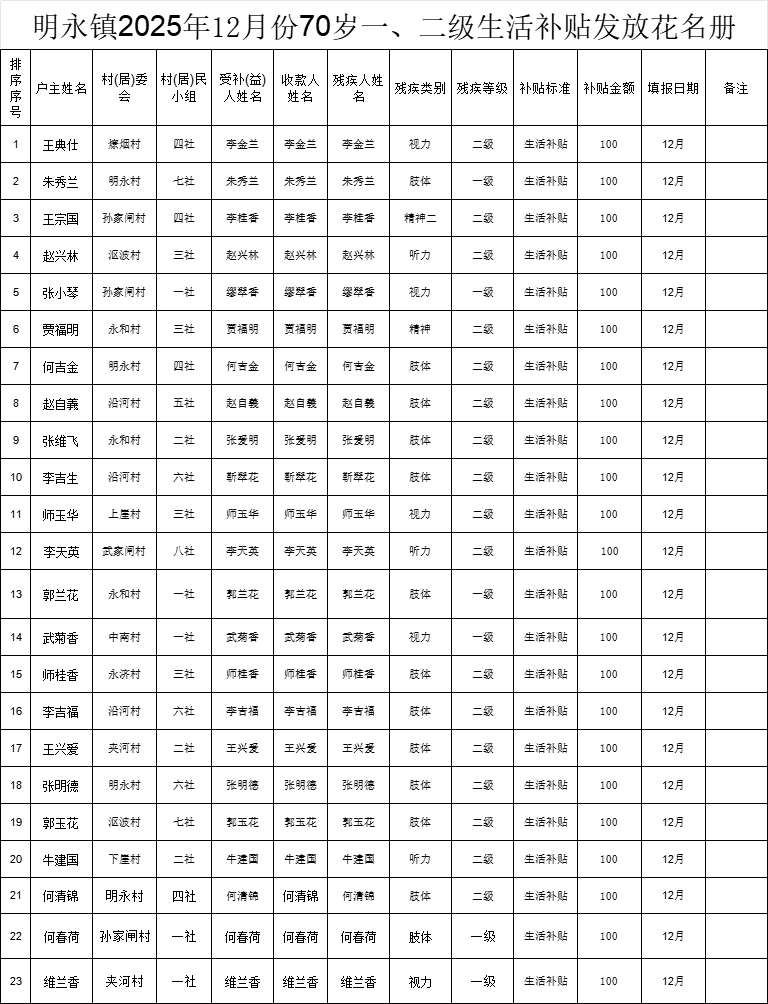 明永镇2025年12月份70岁一、二级生活补贴发放花名册