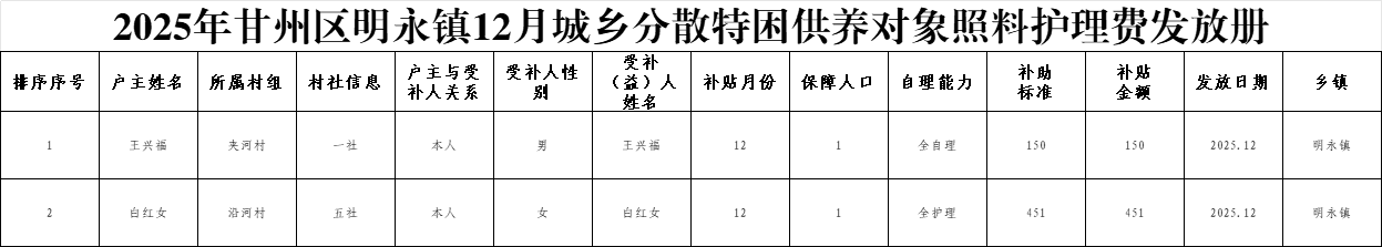 2025年甘州区明永镇12月城乡分散特困供养对象照料护理费发放册