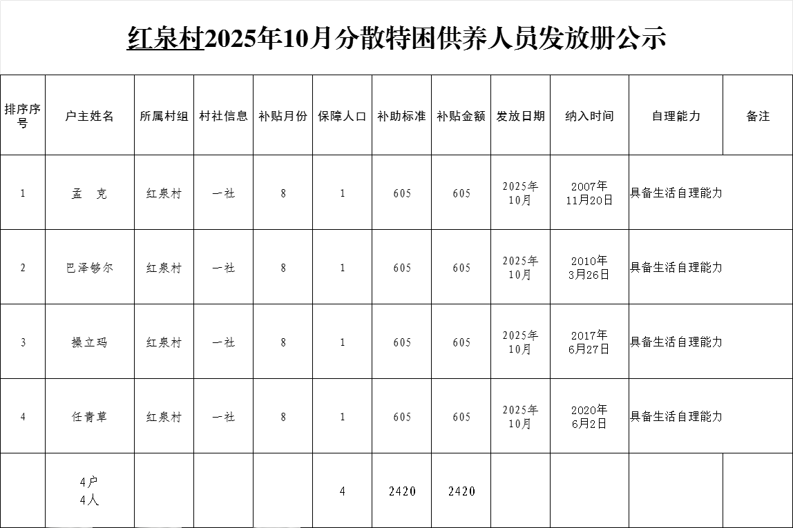 平山湖蒙古族乡红泉村2025年10月分散特困供养人员花名册公示
