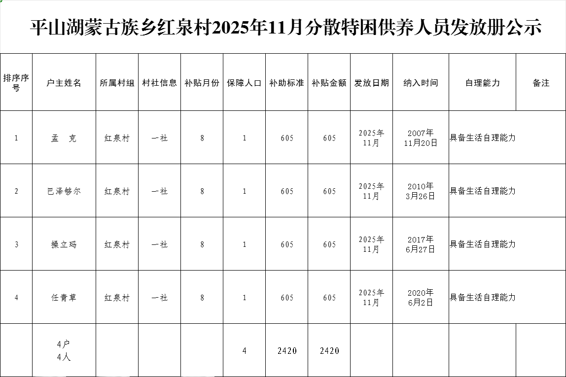 平山湖蒙古族乡红泉村2025年11月分散特困供养人员发放册公示
