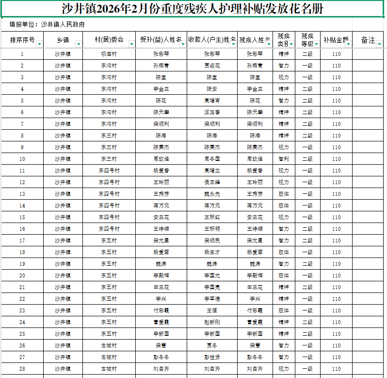 沙井镇2026年2月份重度残疾人护理补贴发放花名册