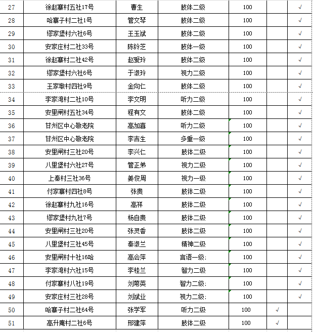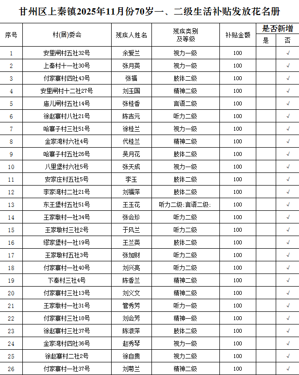 甘州区上秦镇2025年11月份70岁一、二级生活补贴发放花名册