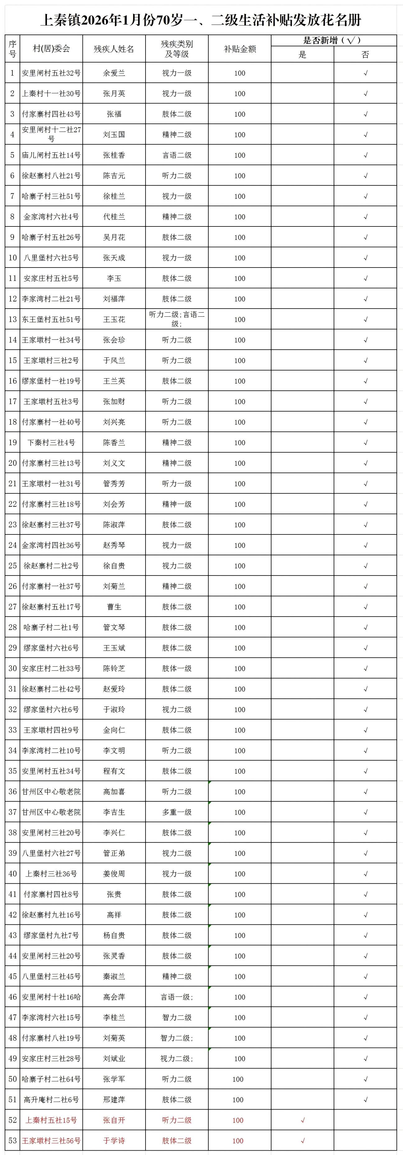 上秦镇2026年1月份70岁一、二级生活补贴发放花名册