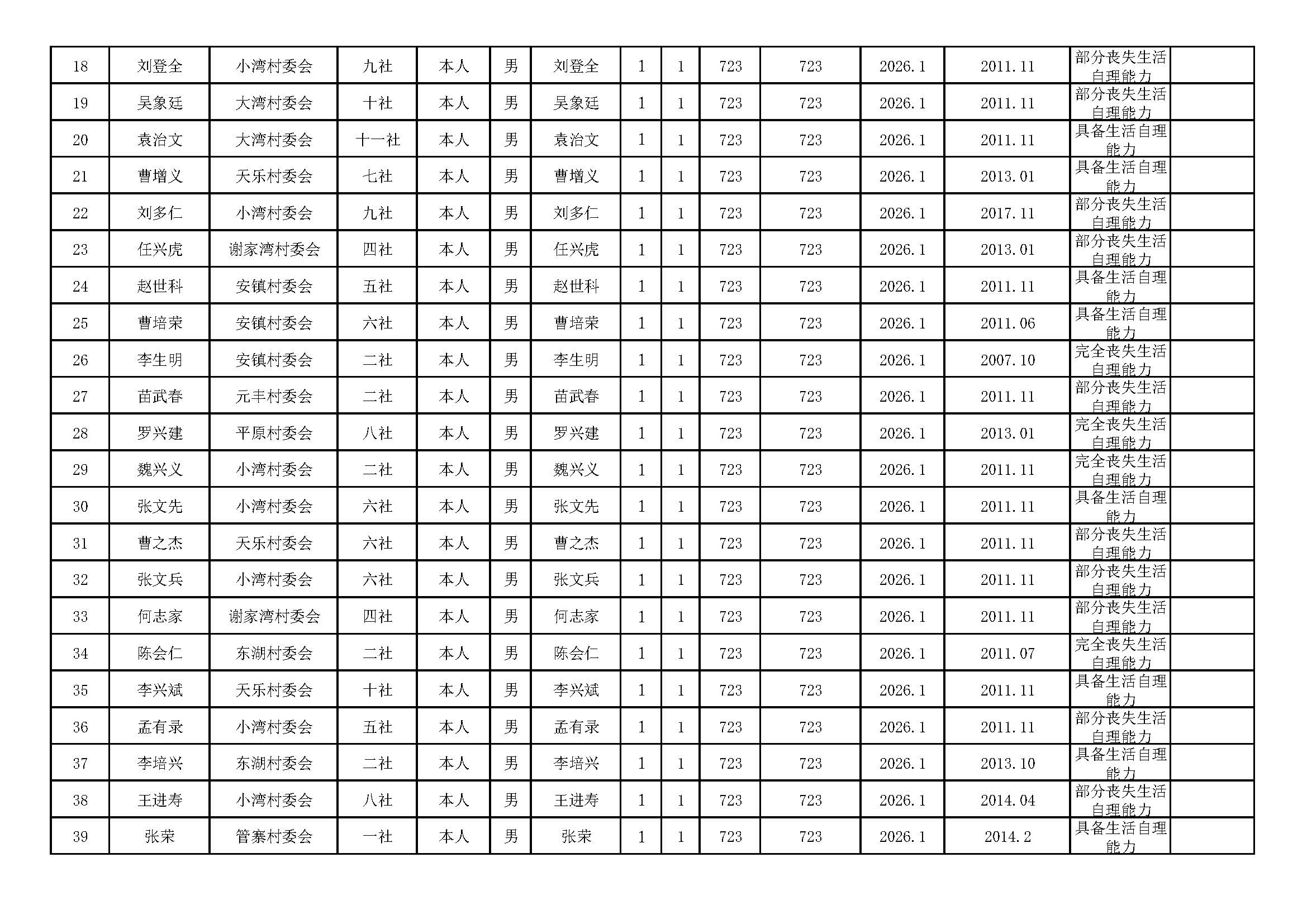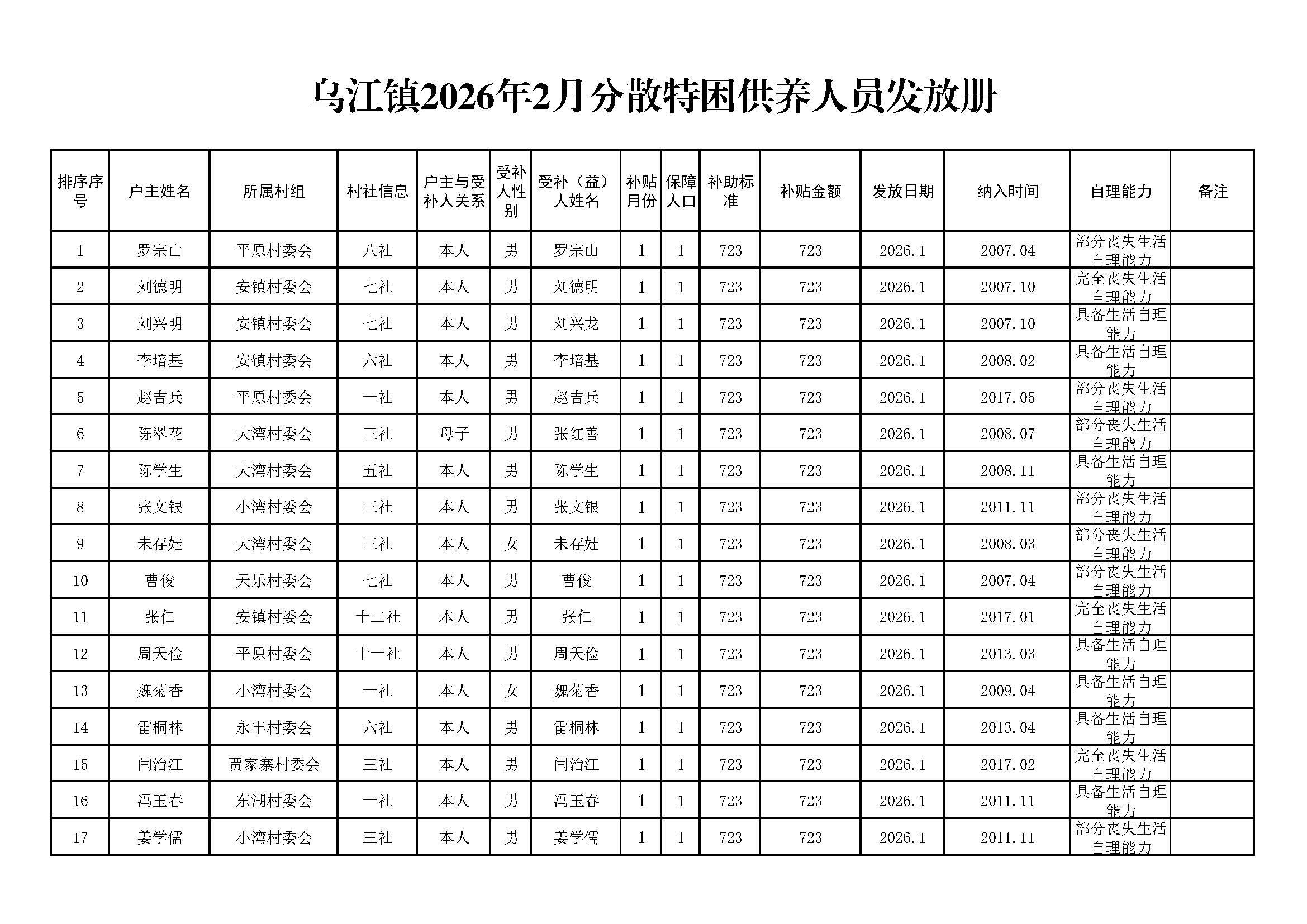 乌江镇2026年2月分散特困供养人员发放册