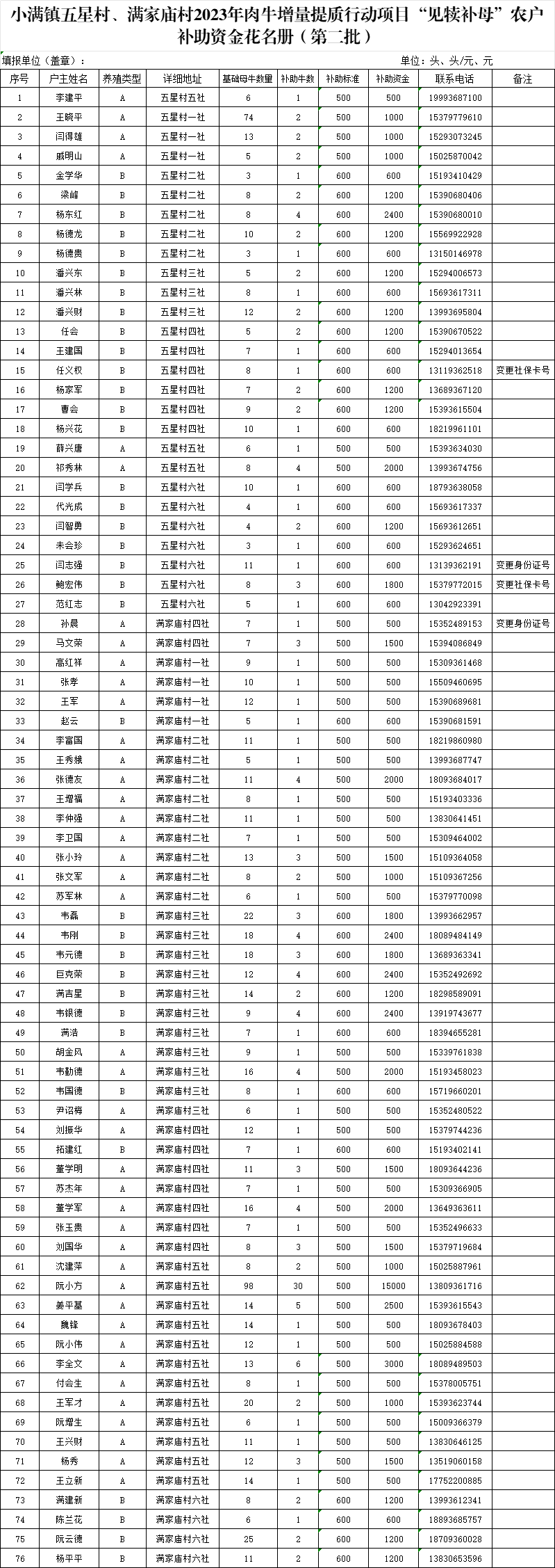 小满镇五星村、满家庙村2023年肉牛增量提质行动项目“见犊补母”农户 补助资金花名册(第二批)