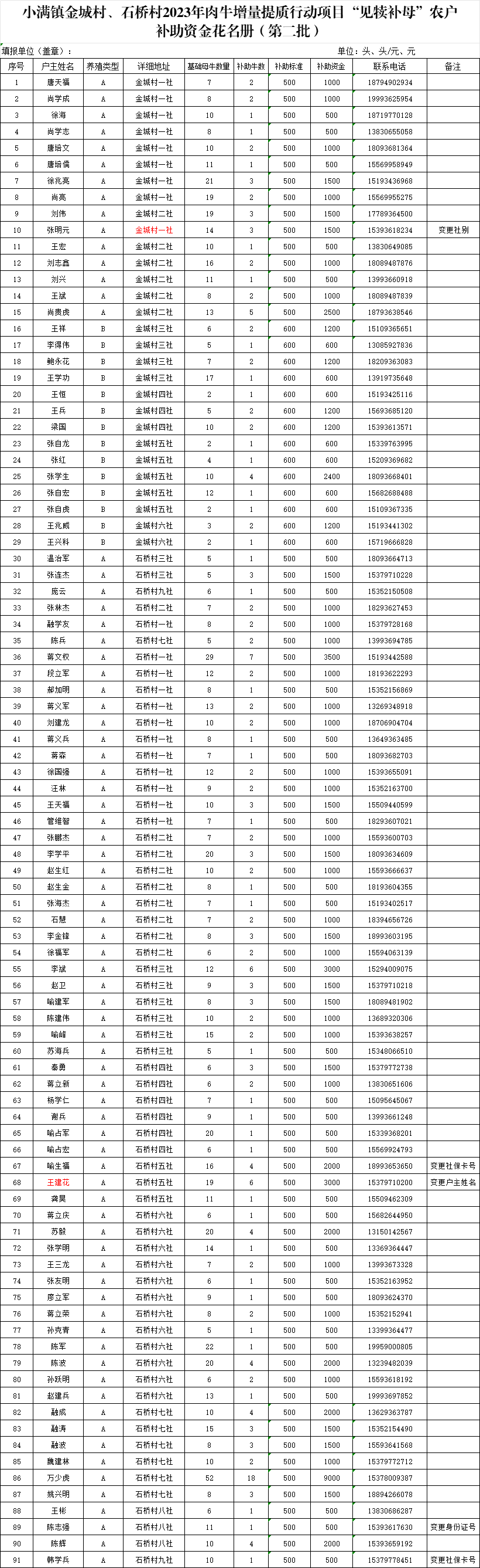 小满镇金城村、石桥村2023年肉牛增量提质行动项目“见犊补母”农户 补助资金花名册(第二批)