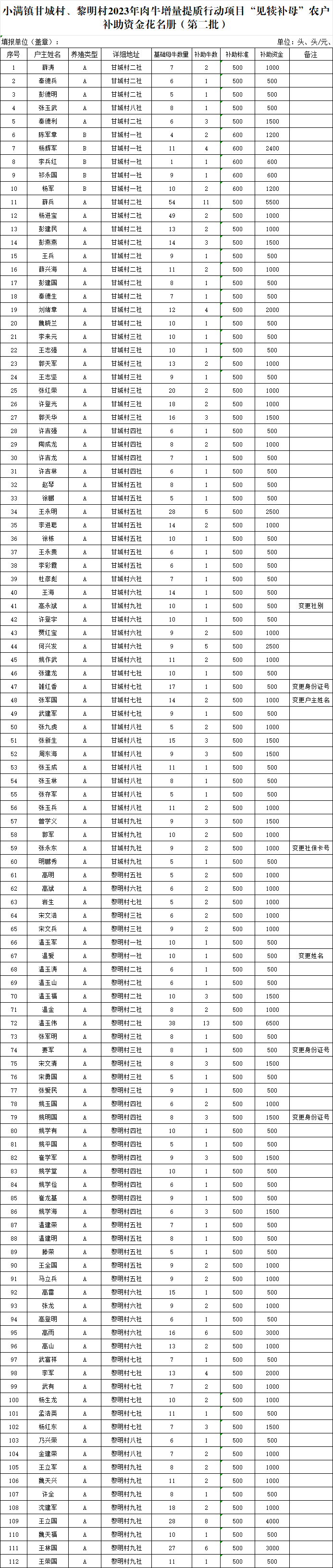 小满镇甘城村、黎明村2023年肉牛增量提质行动项目“见犊补母”农户 补助资金花名册(第二批)
