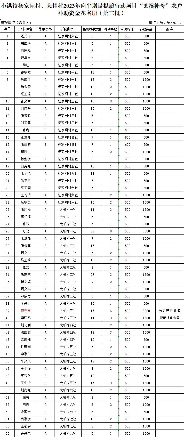 小满镇杨家闸村、大柏村2023年肉牛增量提质行动项目“见犊补母”农户 补助资金花名册(第二批)