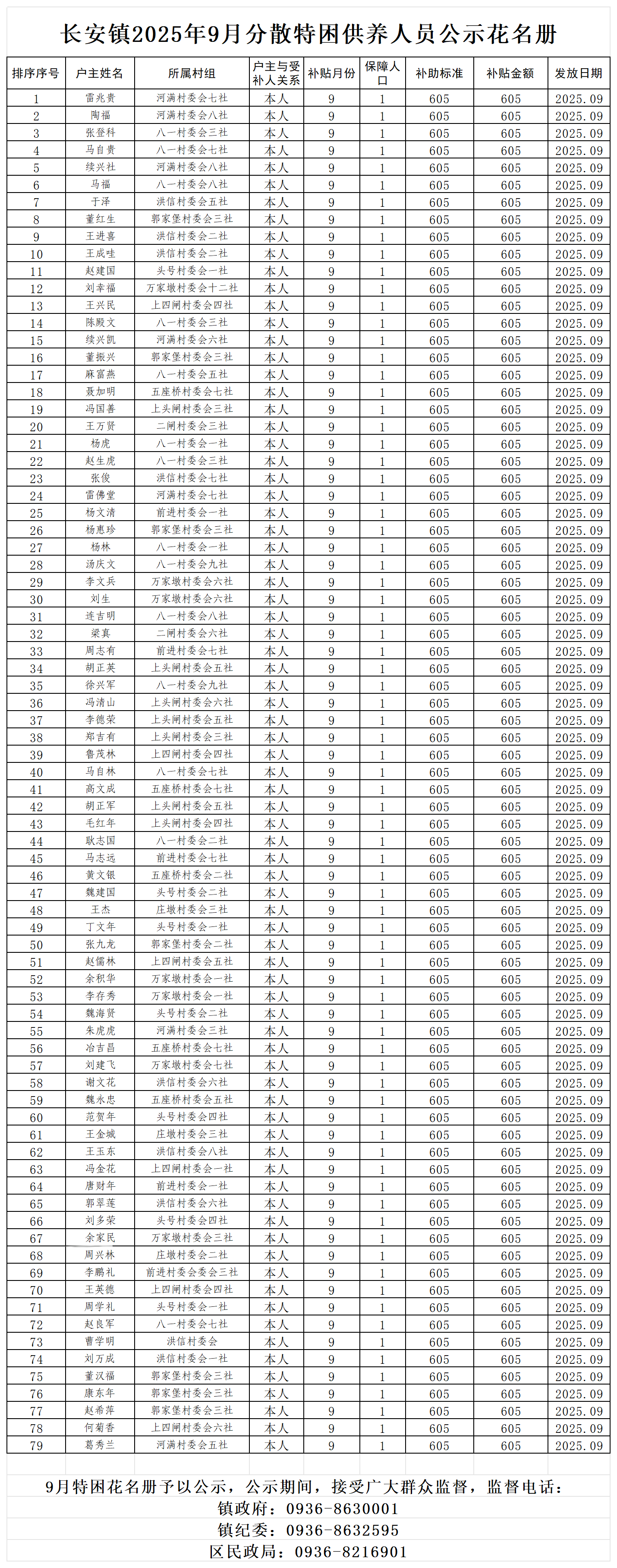 长安镇9月份特困公示花名册