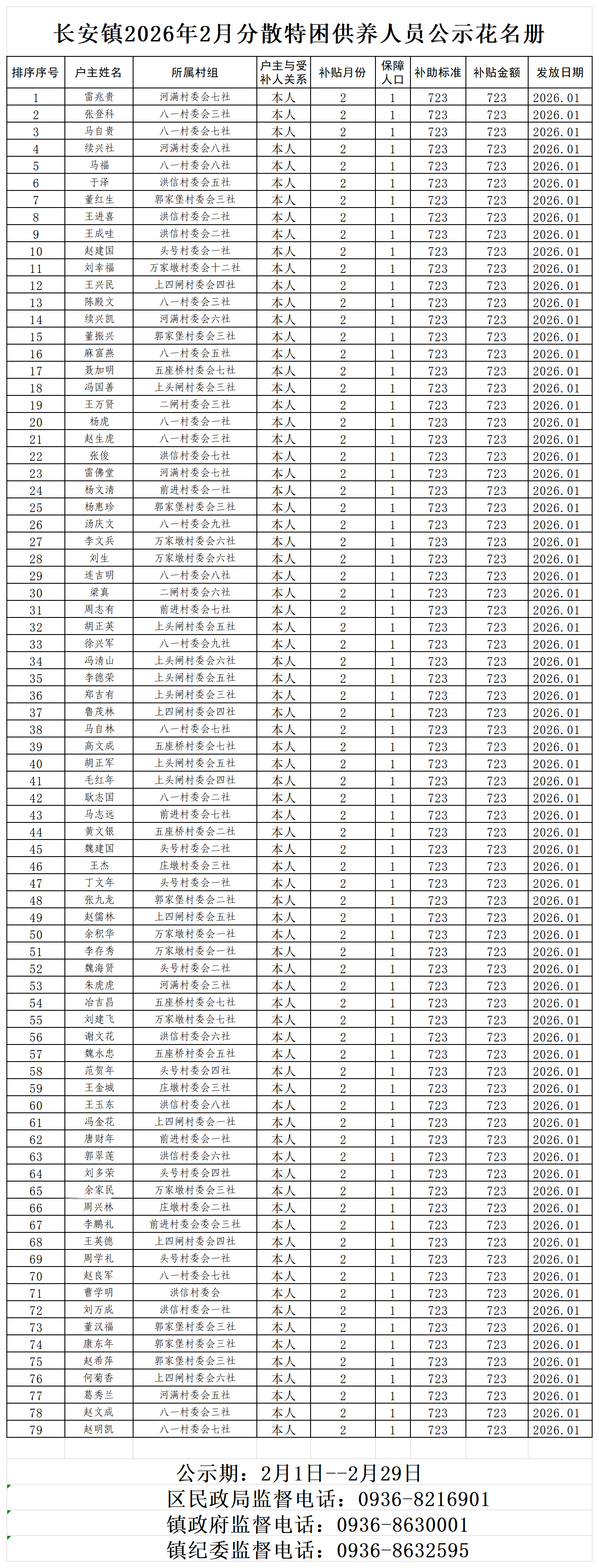 长安镇2026年2月特困公示花名册