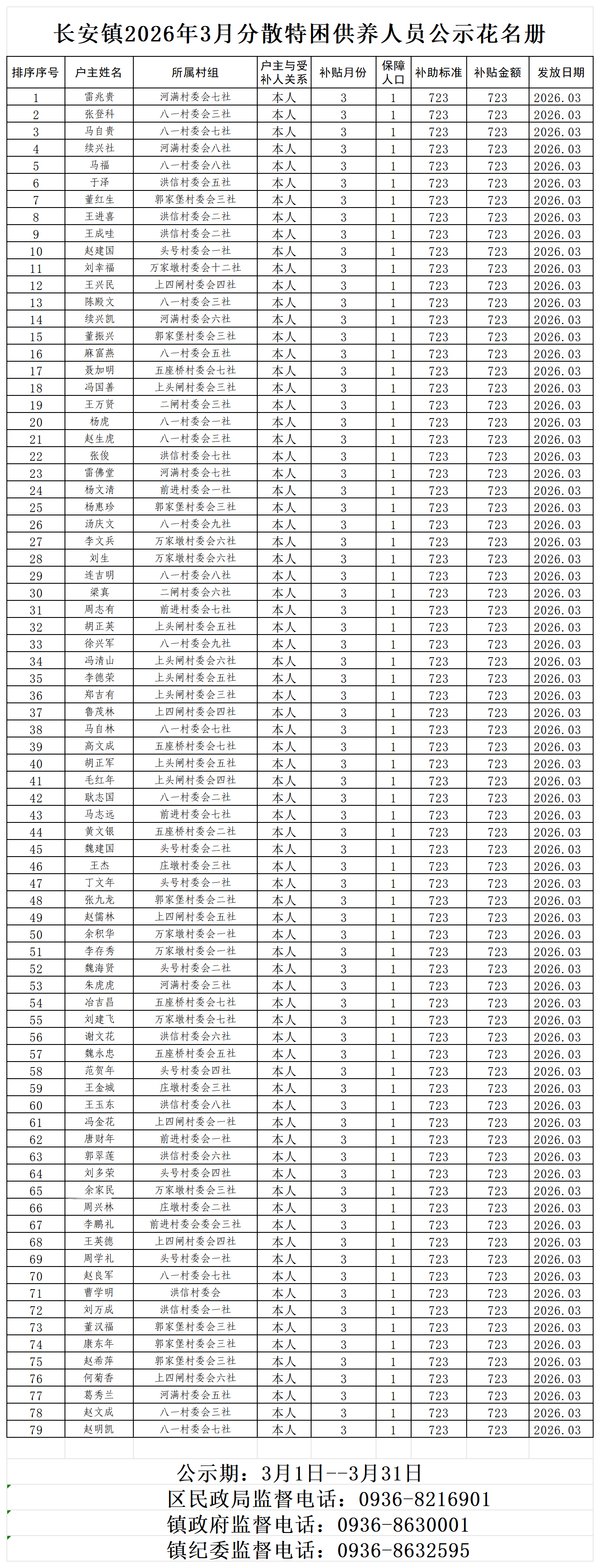 长安镇2026年3月特困公示花名册