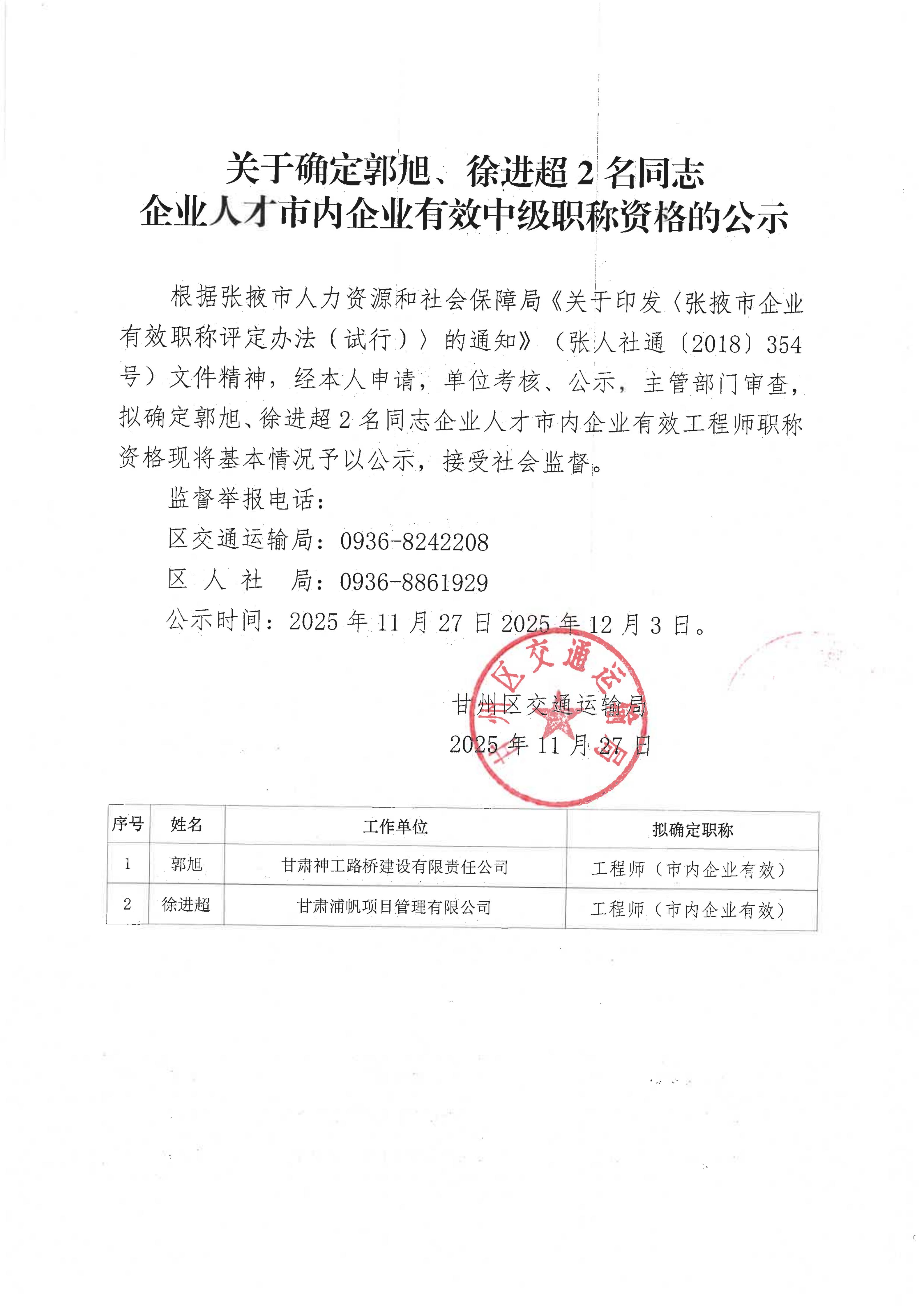 关于确定郭旭、徐进超2名同志企业人才市内企业有效中级职称资格的公示