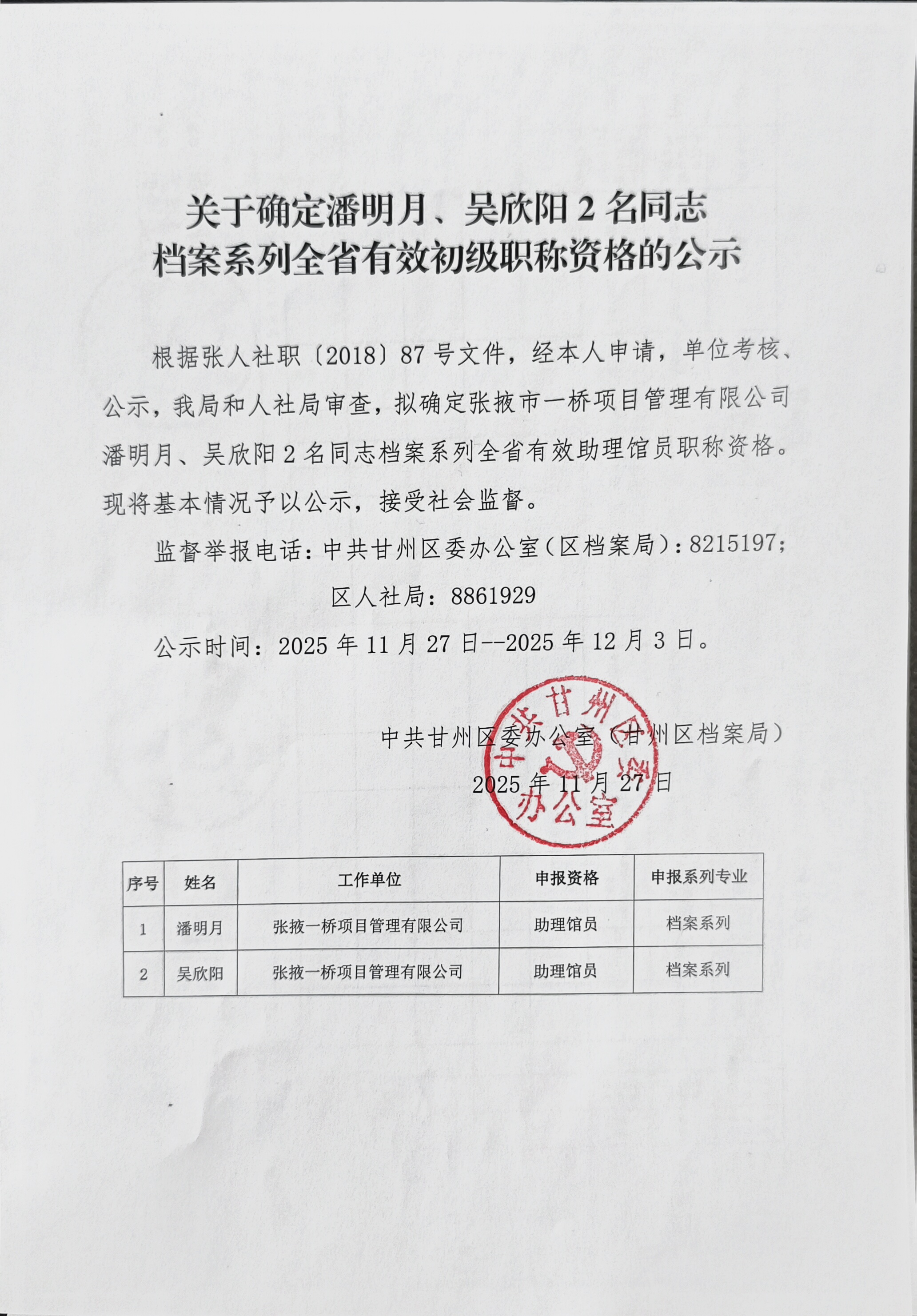 关于确定潘明月、吴欣阳2名同志档案系列全省有效初级职称资格的公示
