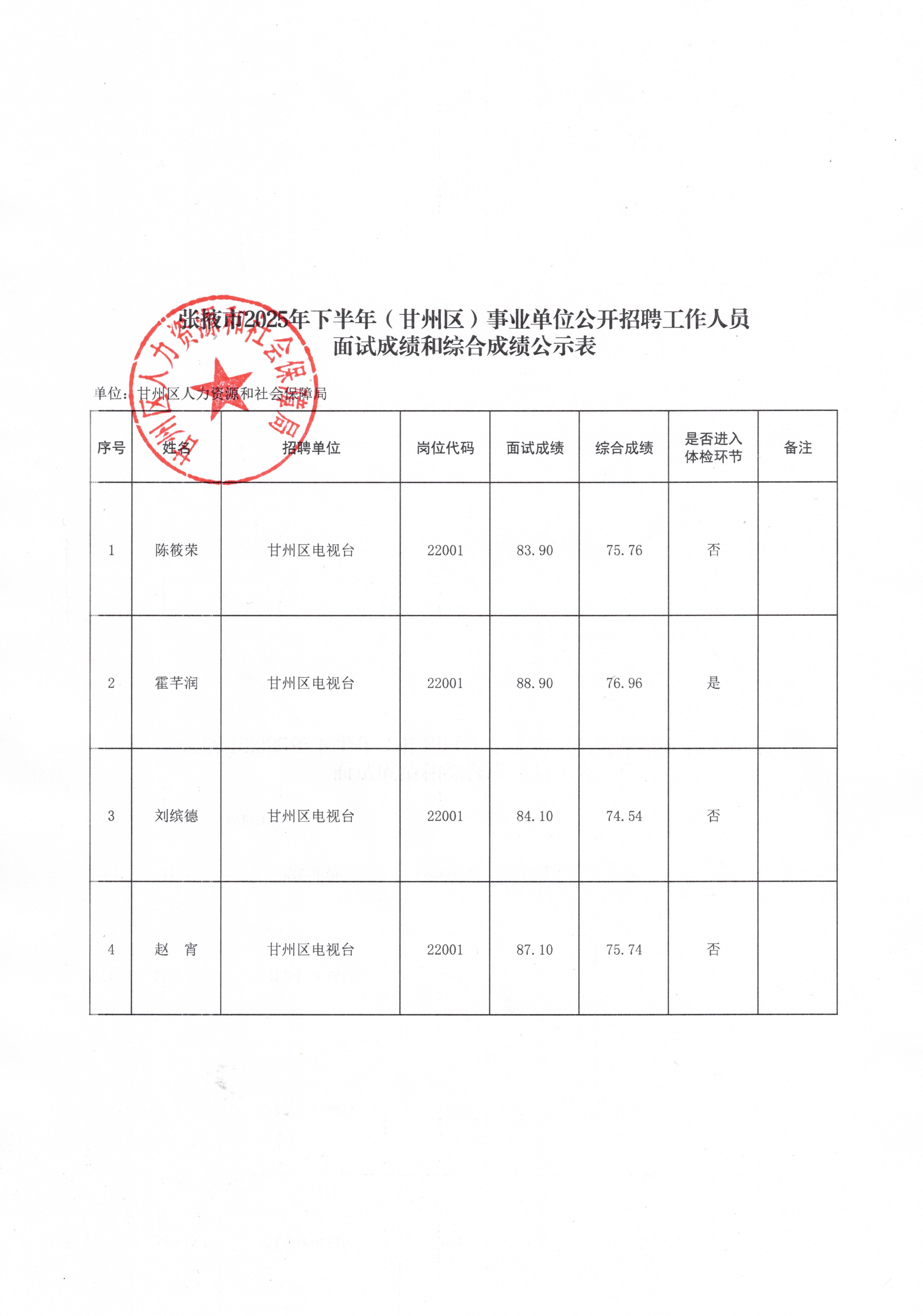 张掖市2025年下半年事业单位公开招聘工作人员面试工作已经结束,现将报考甘州区事业单位工作人员面试成绩和综合成绩公告如下。体检及考察事宜另行通知。