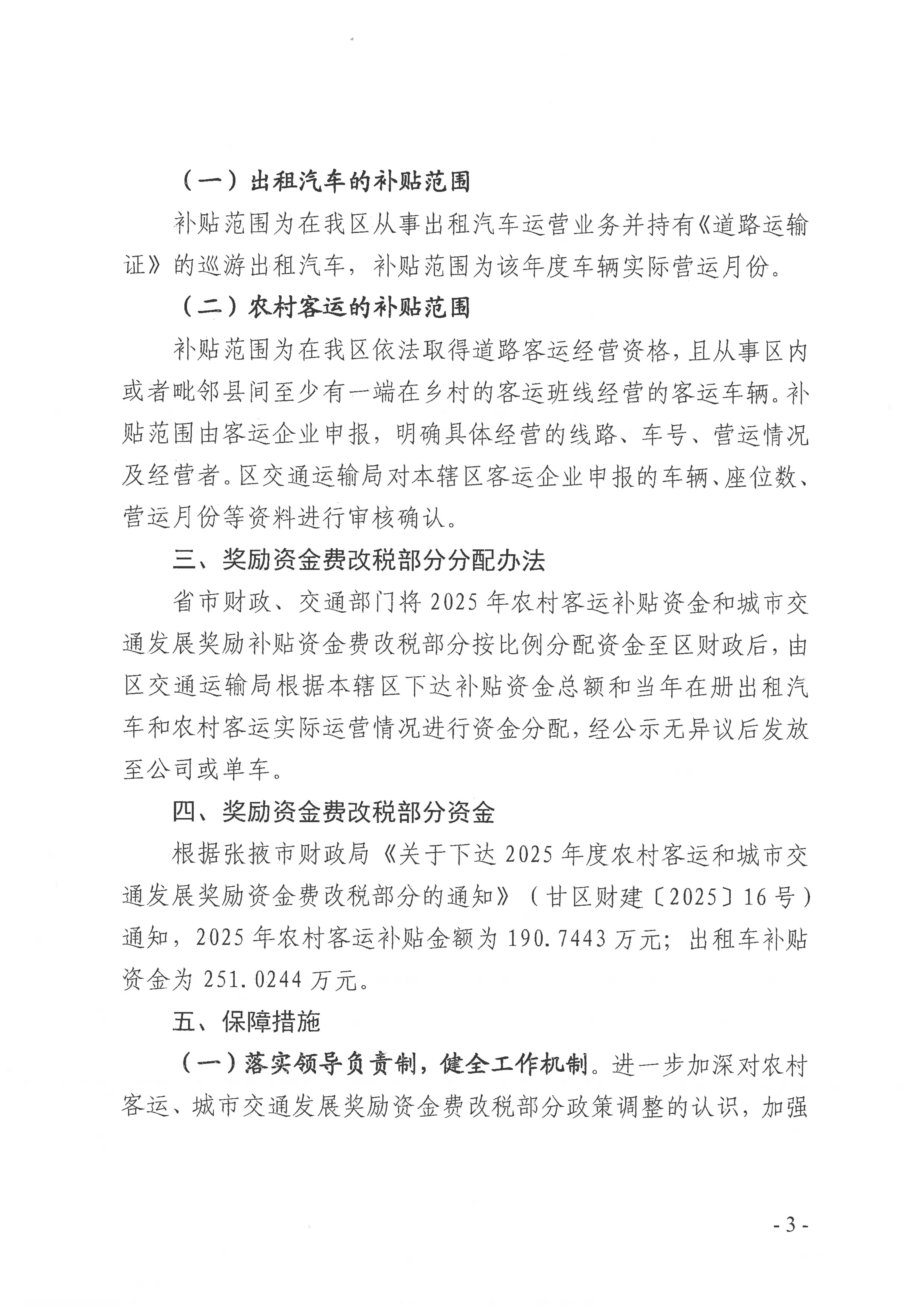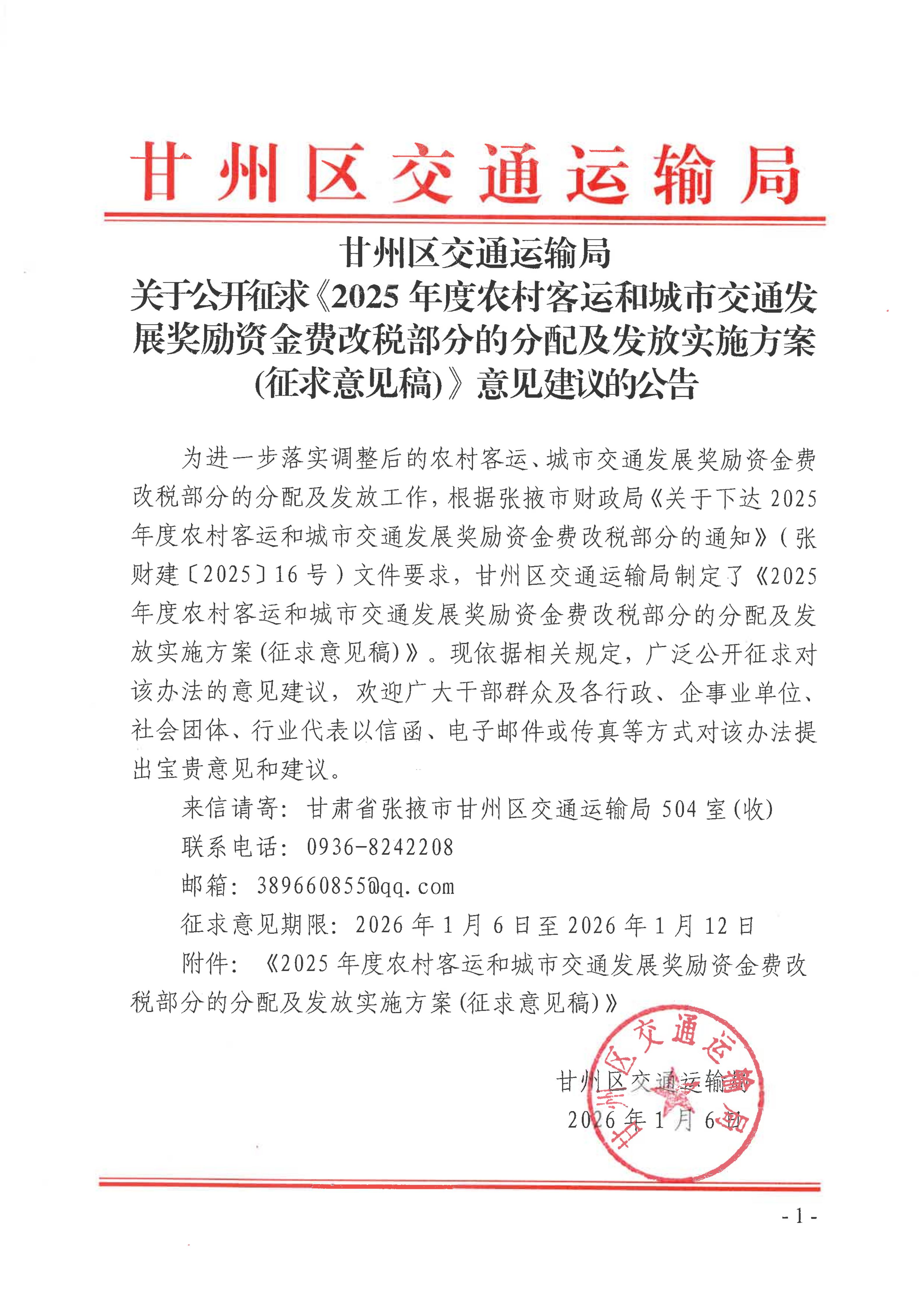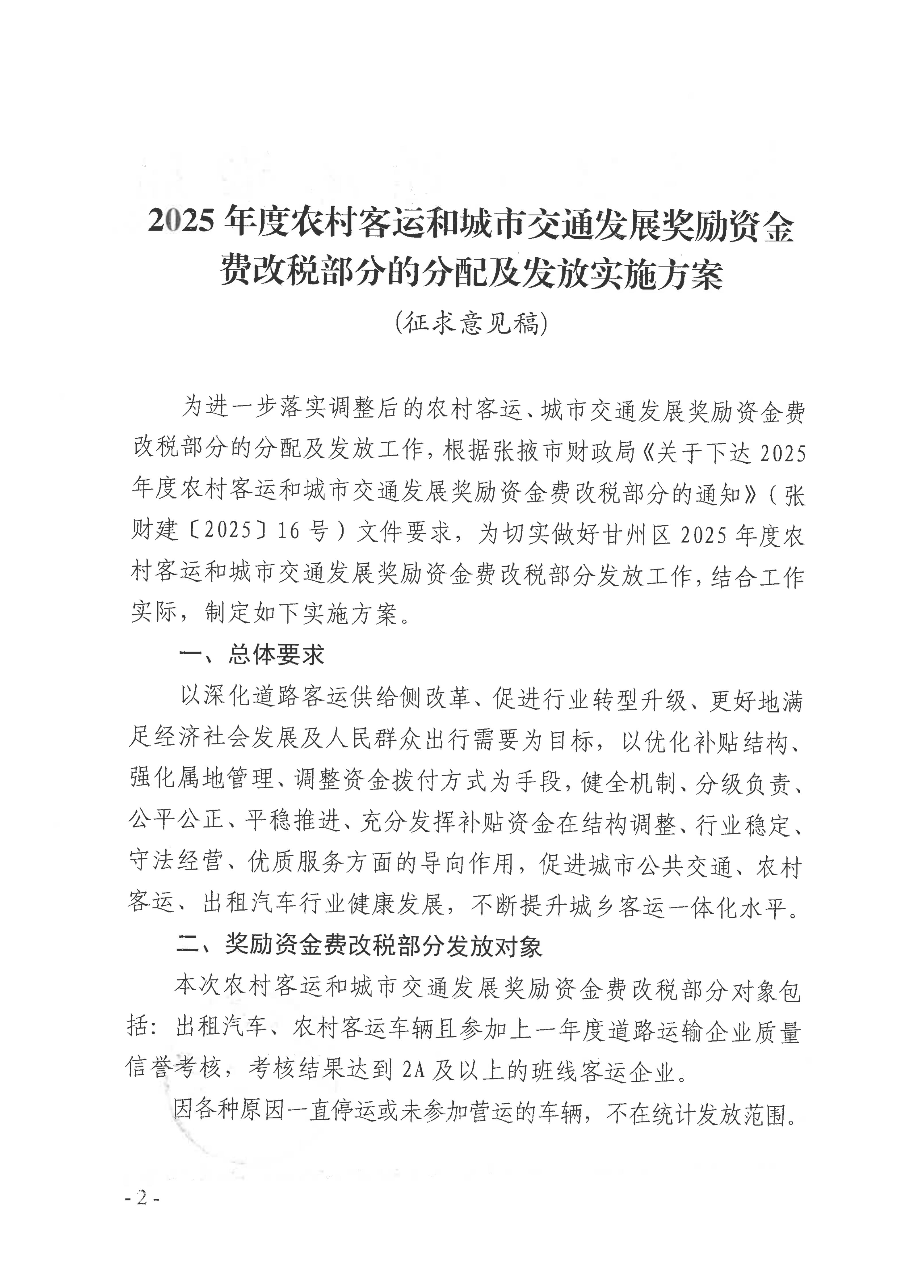甘州区交通运输局关于公开征求《2025年度农村客运和城市交通发展奖励资金费改税部分的分配及发放实施方案(征求意见稿)意见建议的公告》