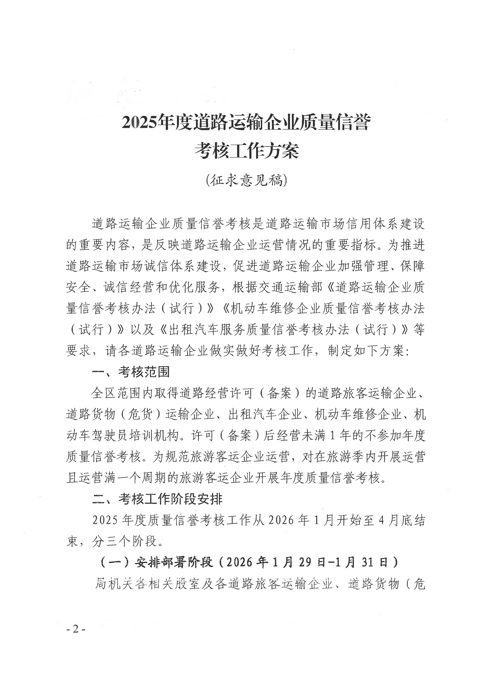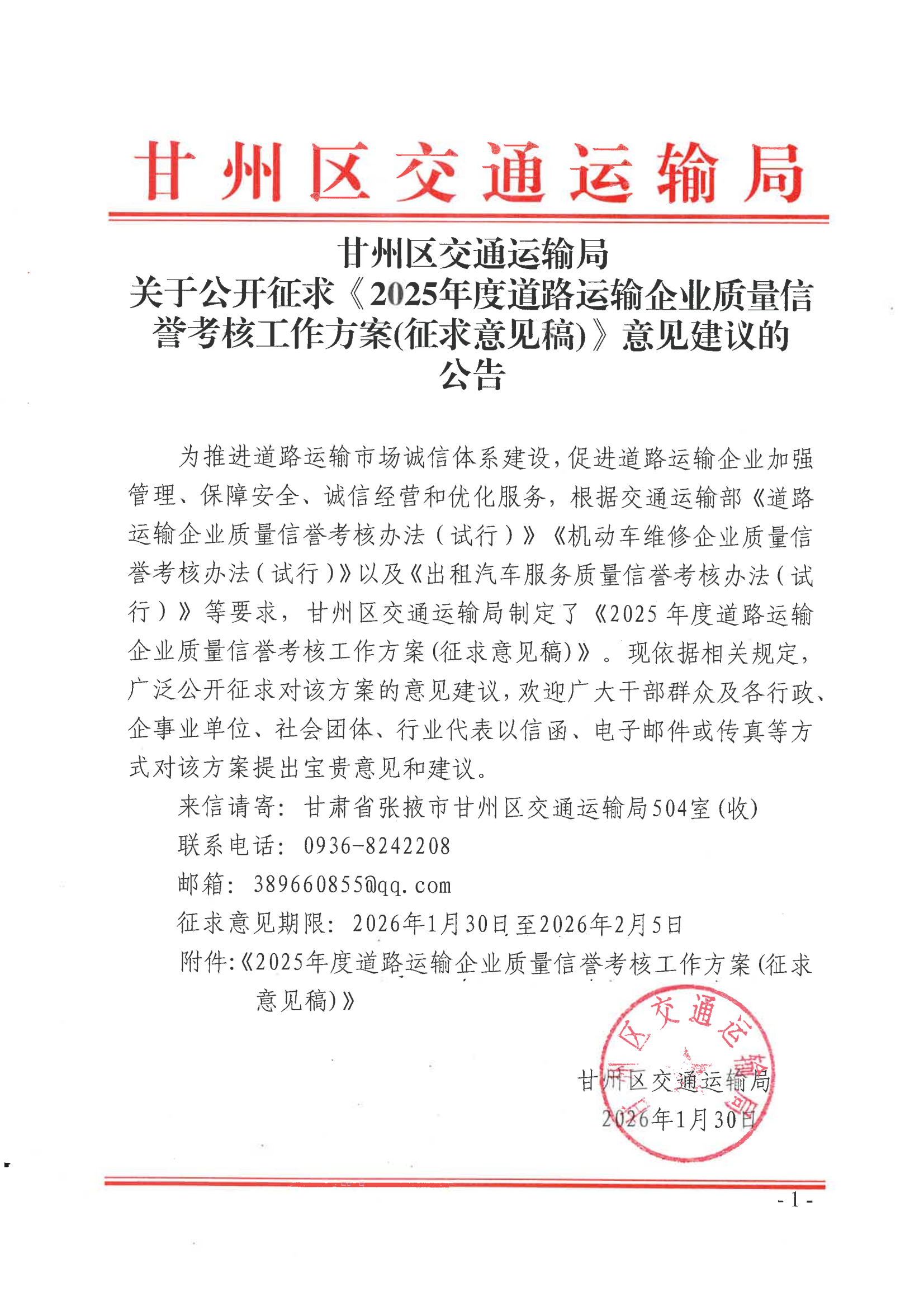 甘州区交通运输局关于公开征求《2025年度道路运输企业质量信誉考核工作方案(征求意见稿)》意见建议的公告