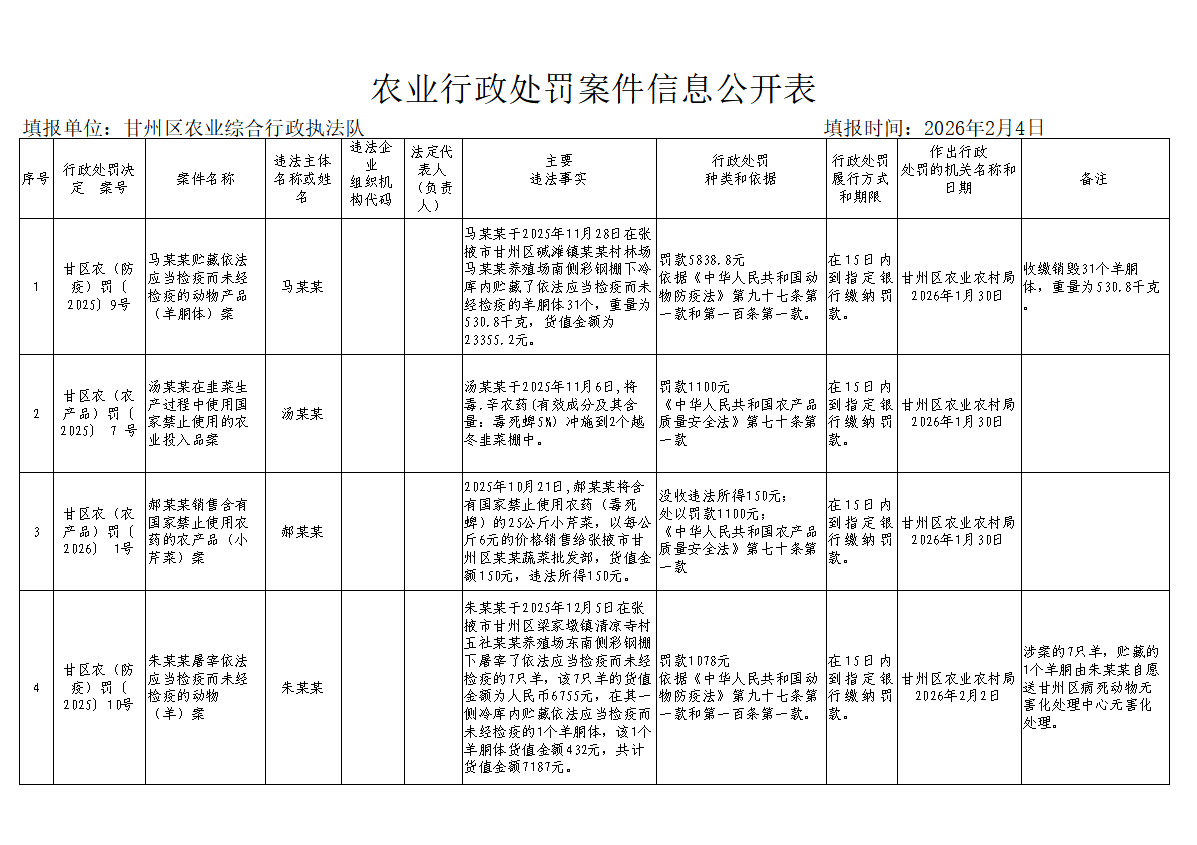 农业行政处罚案件信息公开表