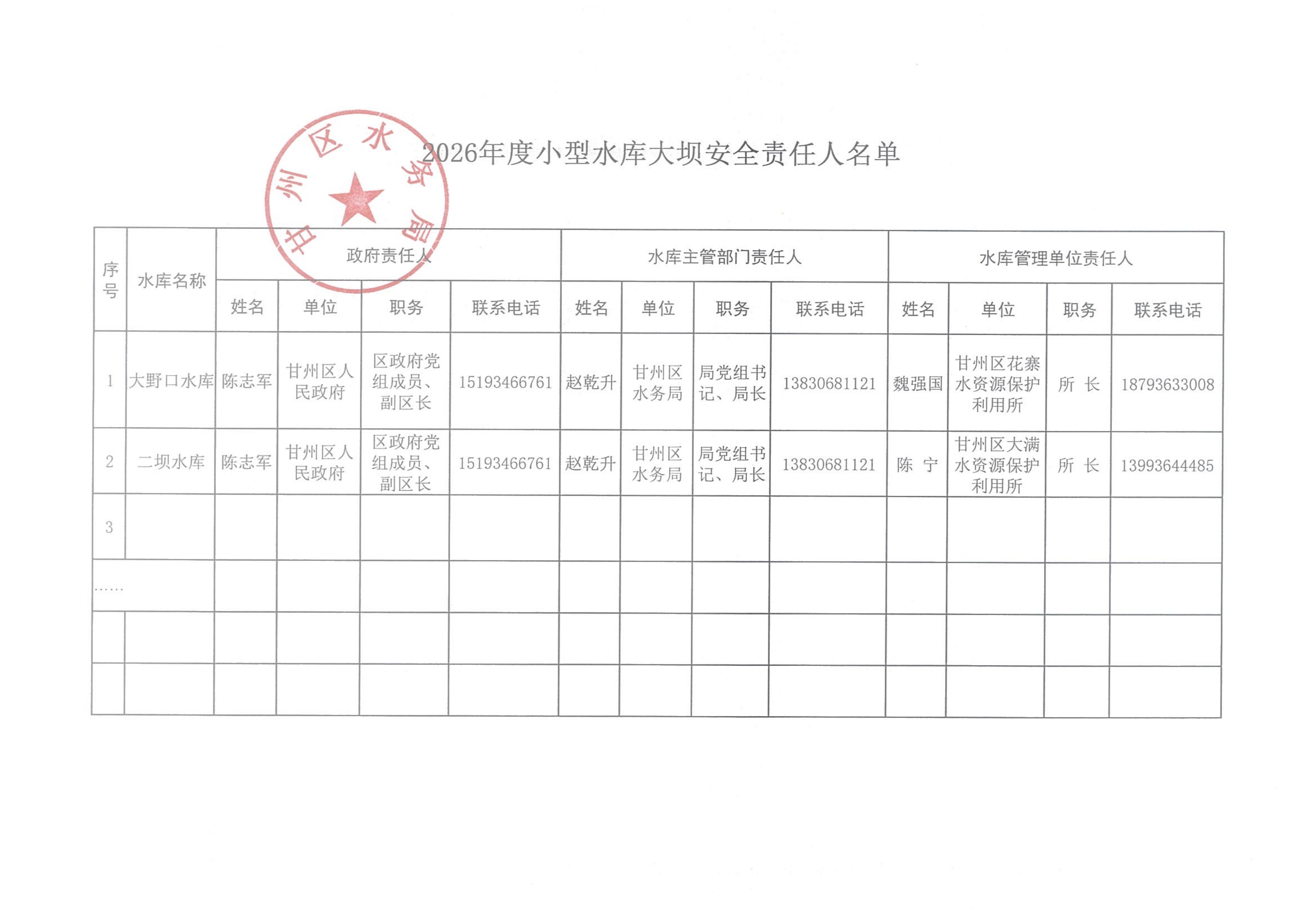 2026年度小型水库大坝安全责任人名单