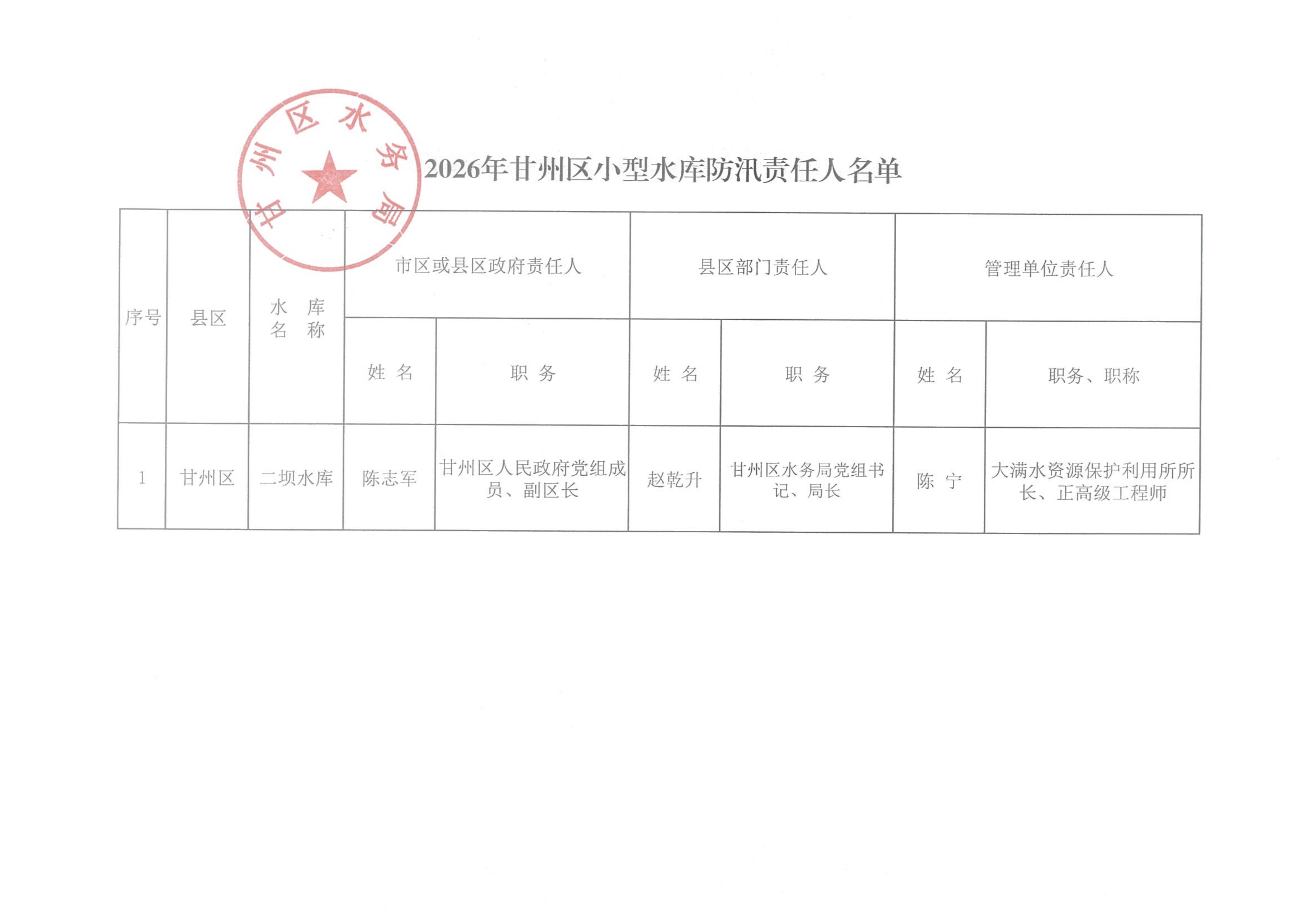 2026年甘州区小型水库防汛负责人名单
