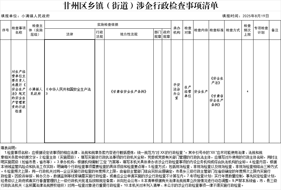 甘州区小满镇涉企行政检查事项清单