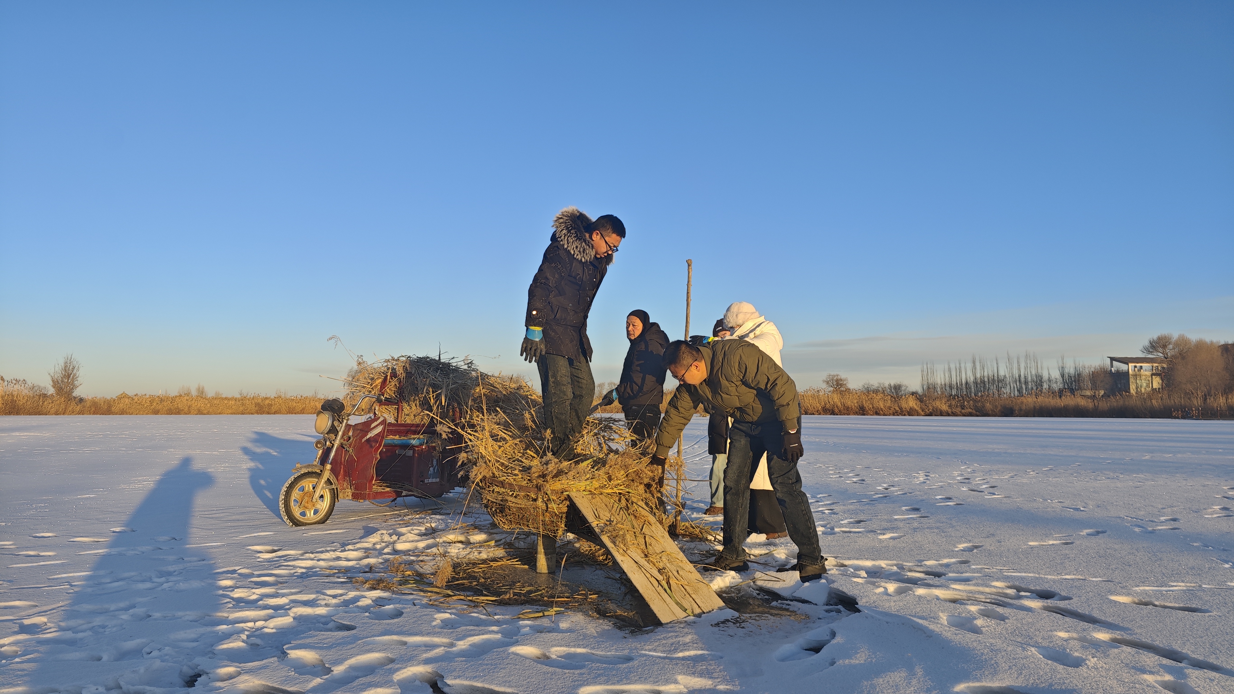 数九寒天,当张掖湿地公园鹤影湖的冰面被白雪覆盖,气温降至零下,在这里却有一群人干得热火朝天。他们搬运芦苇,在冰天雪地中有序地铺垫着人工鸟巢,用行动为即将到来的候鸟筑起一个个温暖的“安乐窝”。