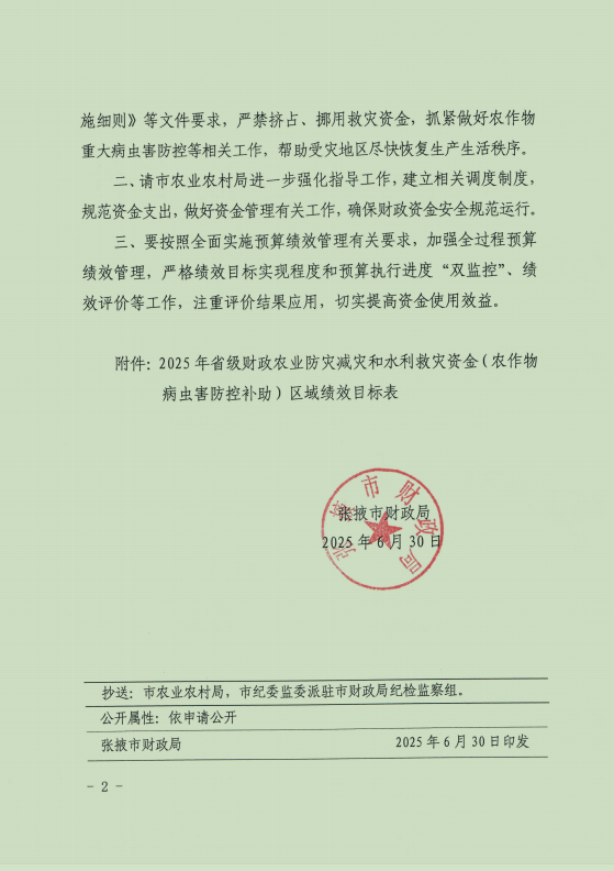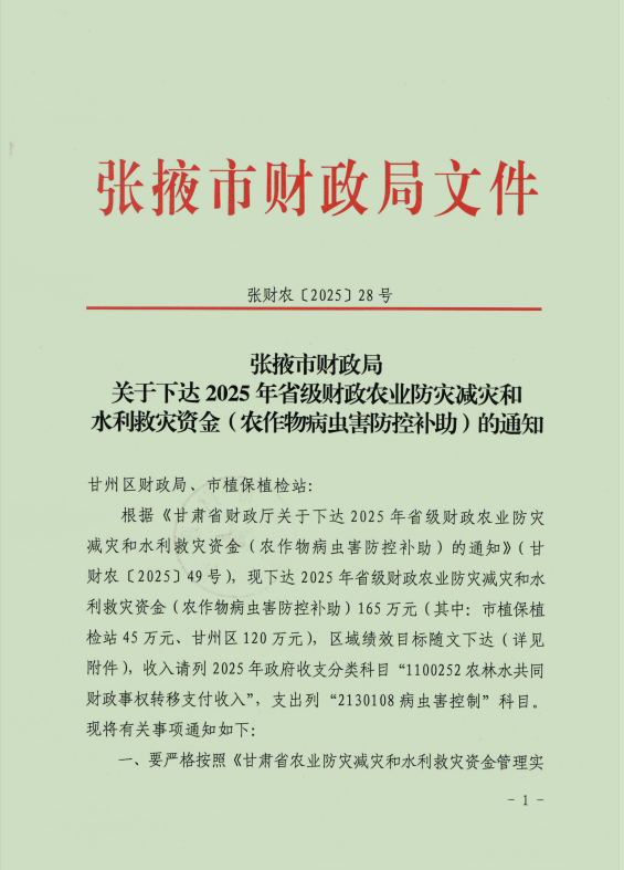 张掖市财政局关于下达2025年省级财政农业防灾减灾和水利救灾资金(农作物病虫害防控补助)的通知