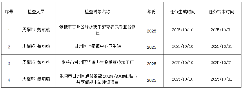 张掖市生态环境局甘州分局2025年10月“双随机、一公开”抽取结果公示(生态环境综合执法一体化管理平台)